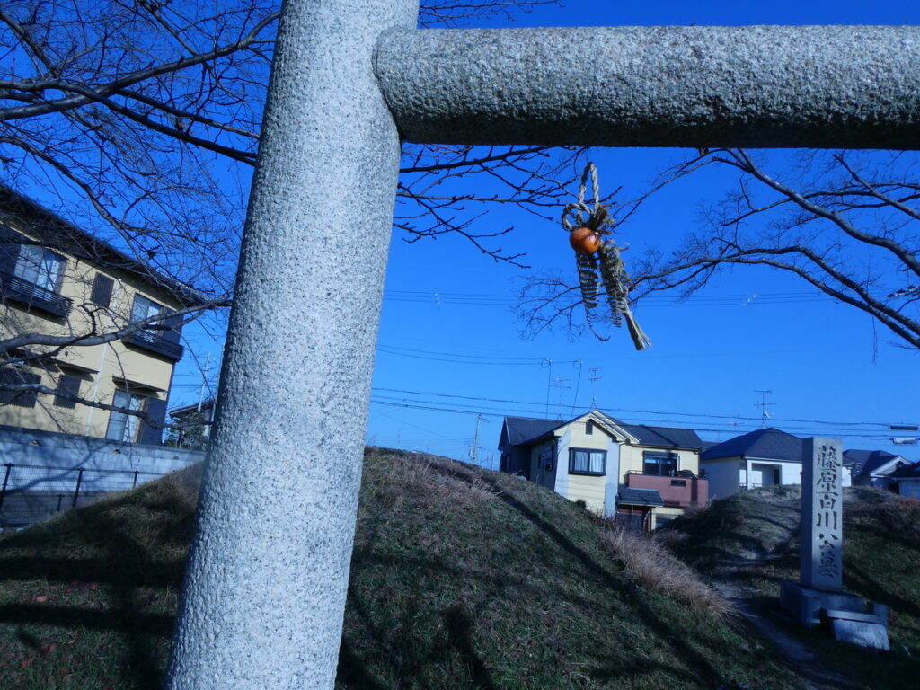 2つの山を背にするように大きなピカピカの安っぽい石碑が建っている。石に刻まれた文字も現代的で有難みを感じられず石碑をますますショボく見せる効果を数倍増にしている。しかし刻まれている内容は「藤原百川公墓」と、威厳がある。このギャップ。