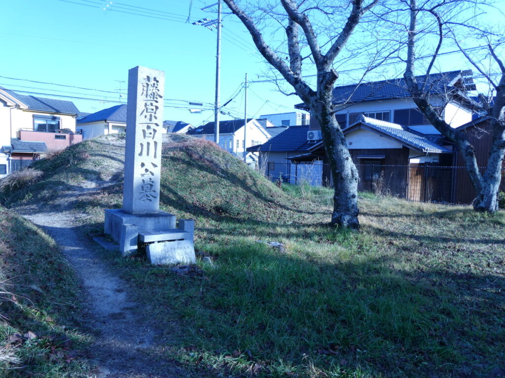 『日本後紀』や『延喜式』に、相楽郡に百川の墓有り、の記録があるが、ピンポイントでの場所は定かではない。明治27年に伝承や江戸時代の文献をもとに「藤原百川の墓」と認定された場所がここ。明治28年に平安遷都1100年を記念し整備された。