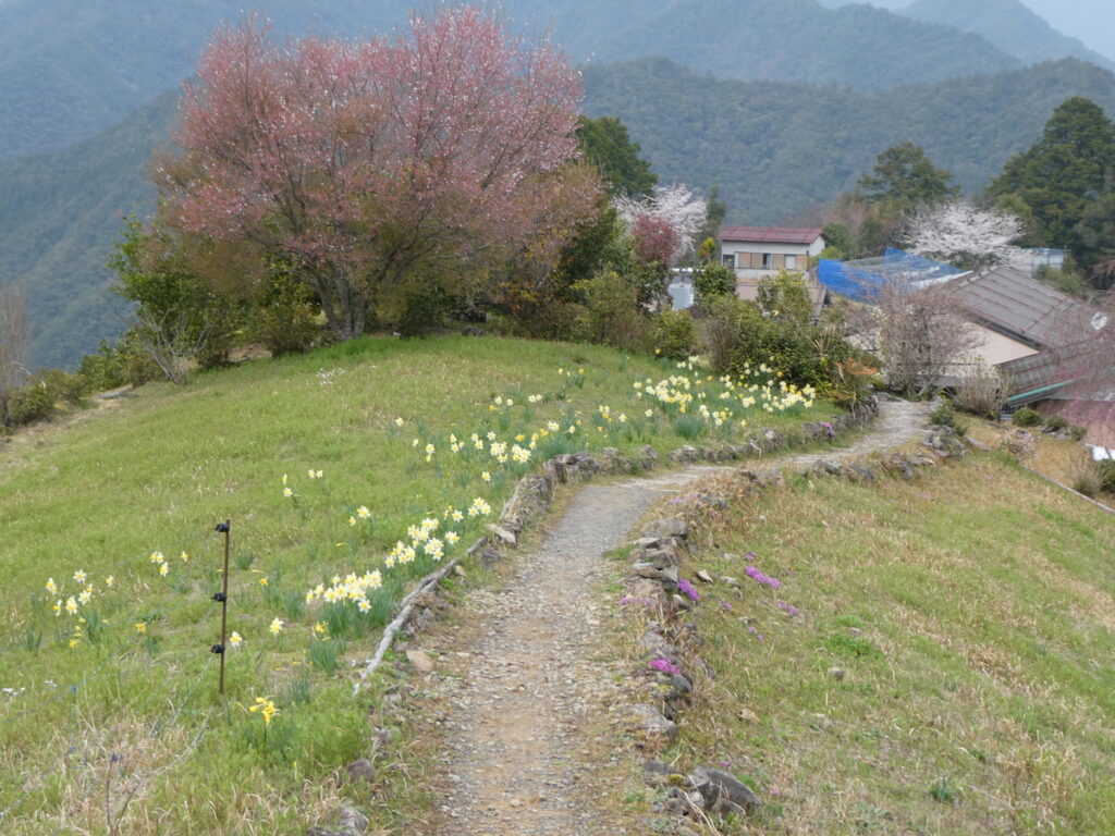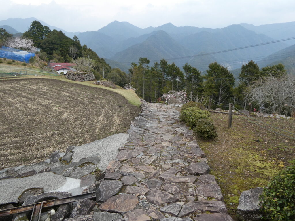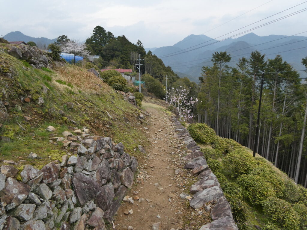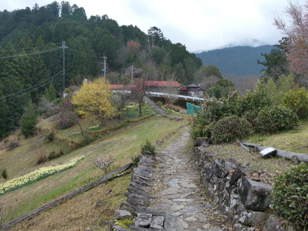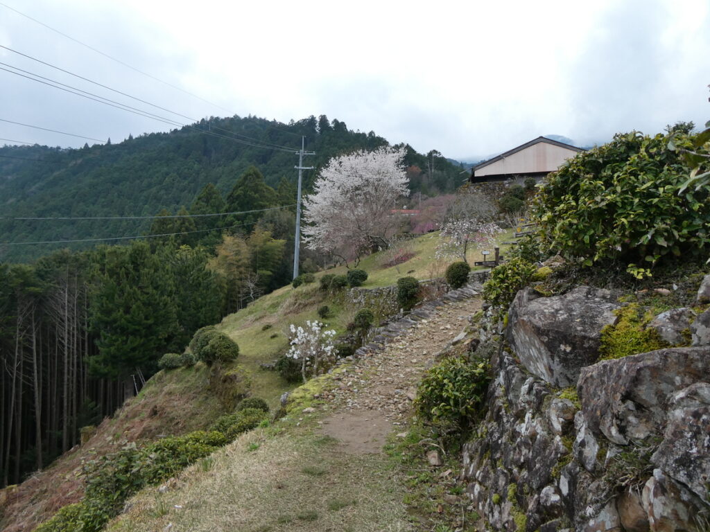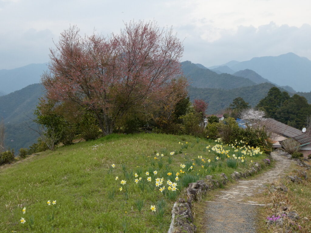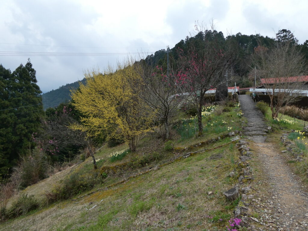 道路から左側に入ると、そこが世界遺産エリアである。一人しか通れない狭い小道が続いている。道端には可愛い花が咲き、木にもピンクや白や黄色の花が咲き誇っている。漫画日本昔話に出てくる古の風景みたい。小道の先にはいくつもの壮大な山々。