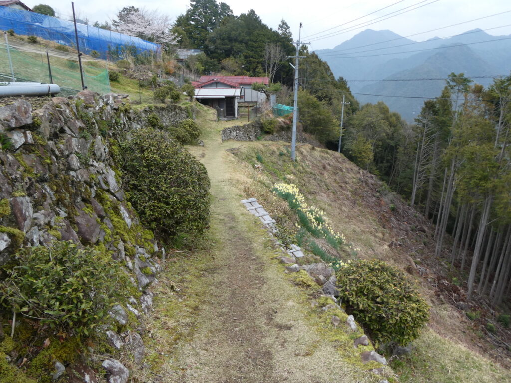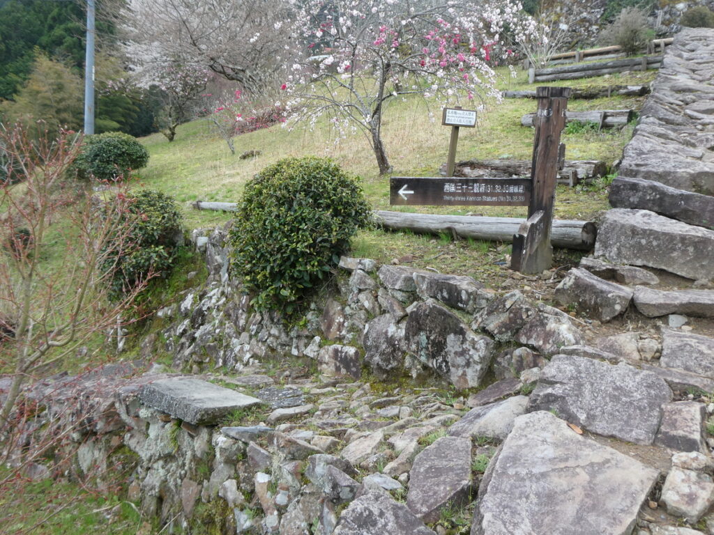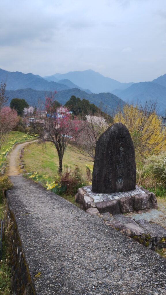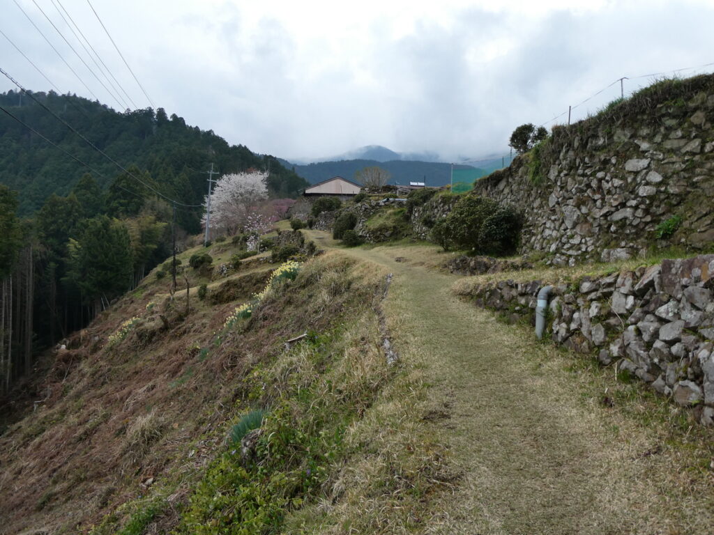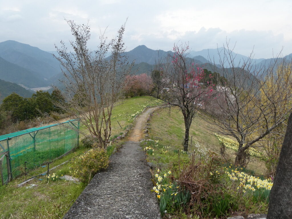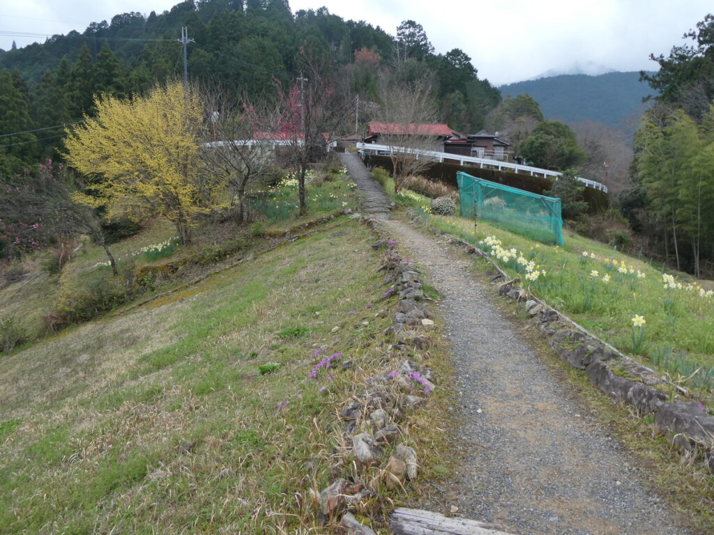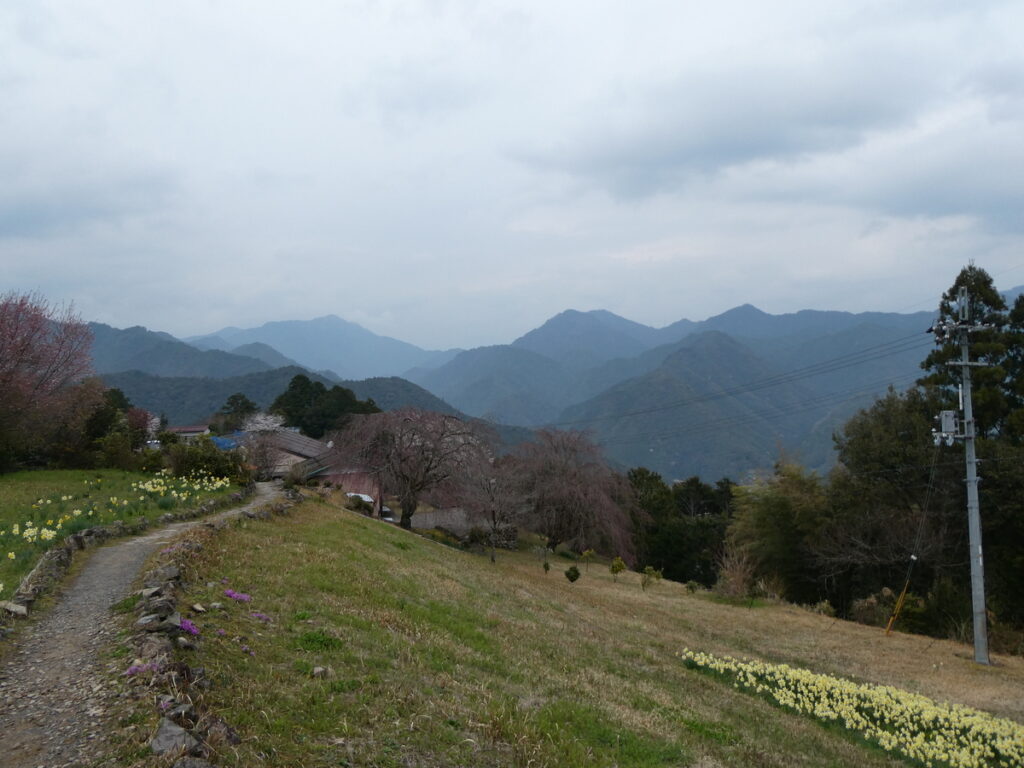 道路から左側に入ると、そこが世界遺産エリアである。一人しか通れない狭い小道が続いている。道端には可愛い花が咲き、木にもピンクや白や黄色の花が咲き誇っている。漫画日本昔話に出てくる古の風景みたい。小道の先にはいくつもの壮大な山々。