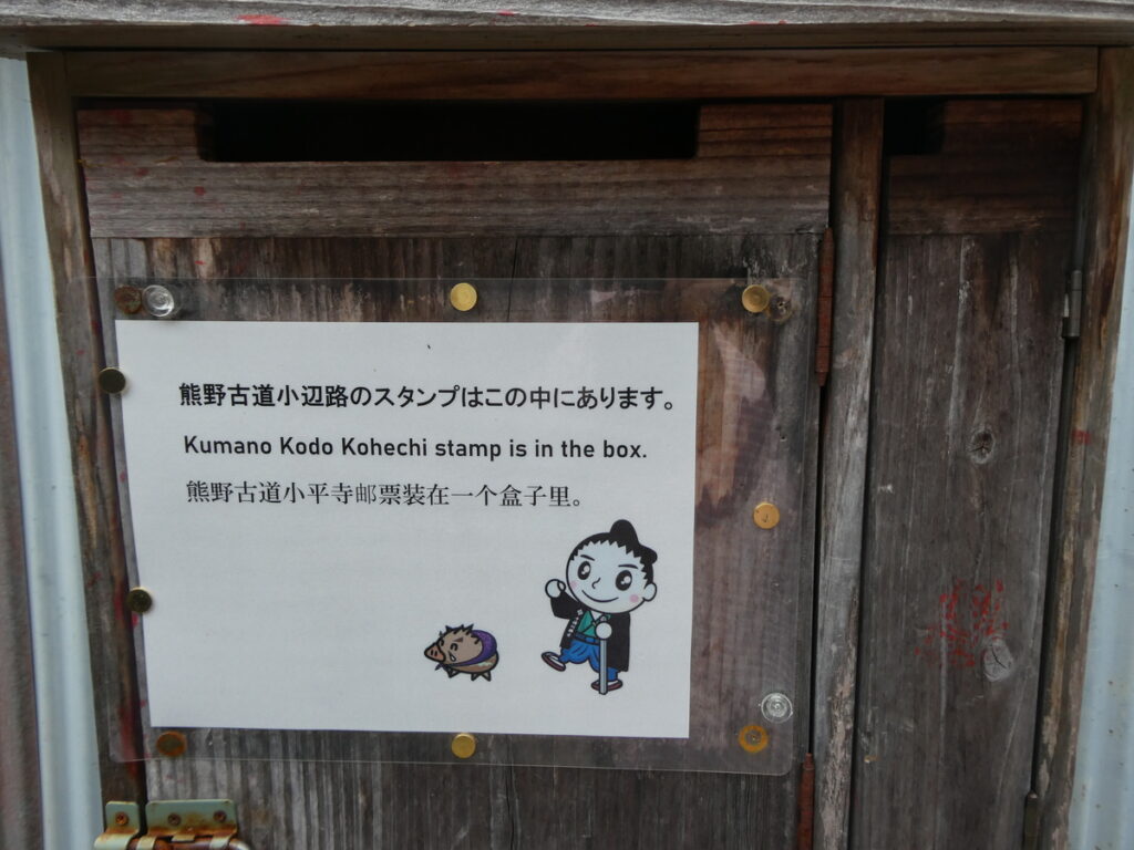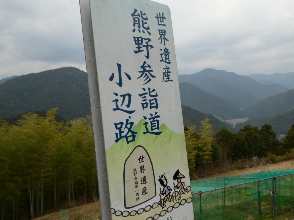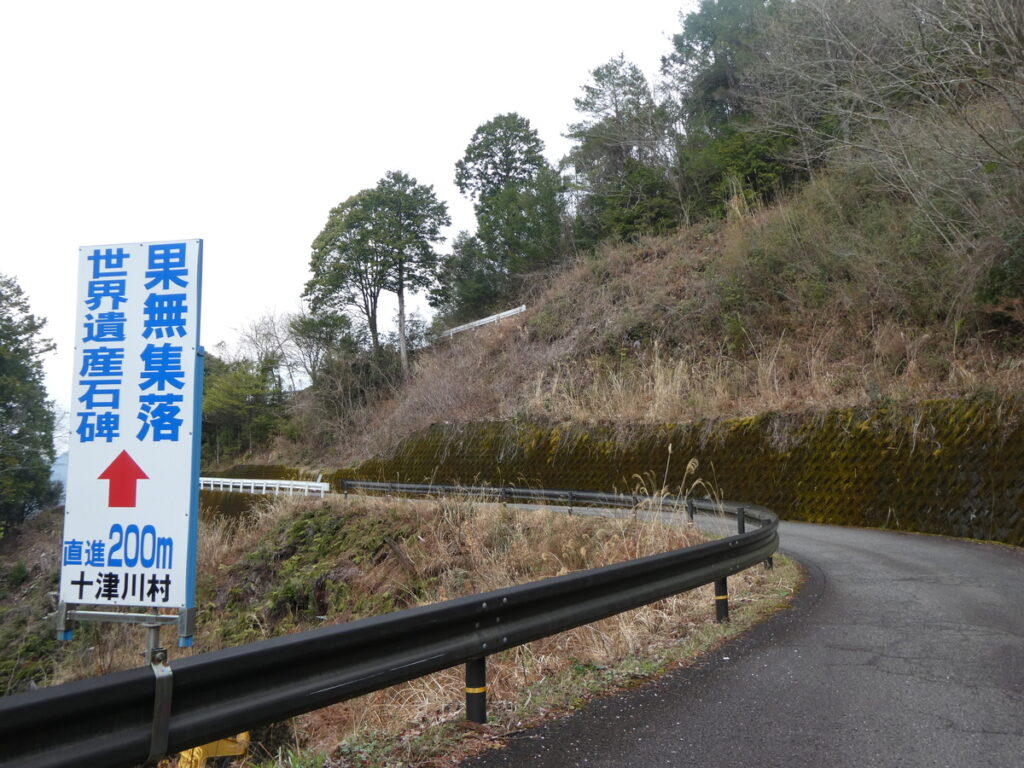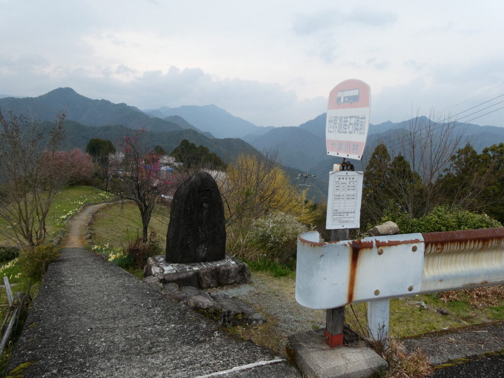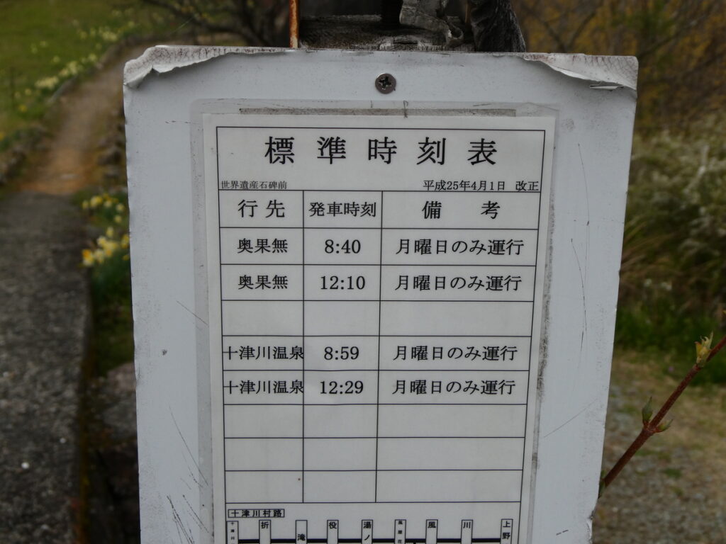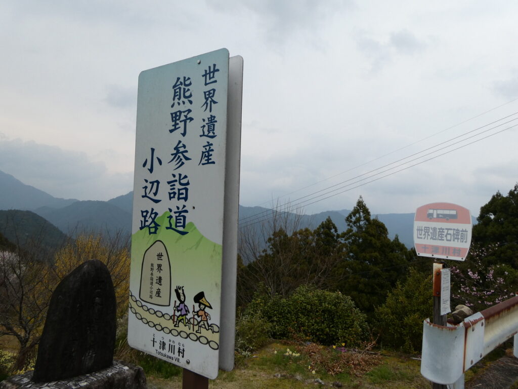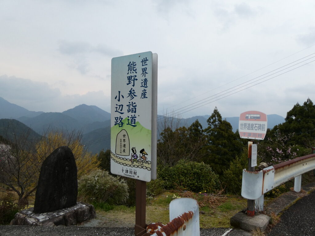 そこから200mほど歩くと、「世界遺産 熊野参詣道小辺路」と書かれた看板と石碑。そして、「世界遺産石碑前」という名称のバス停がある。あの細い道をバスも通っている、ということだ。バスは月曜日のみ運行で「奥果無」行が2本、「十津川温泉」行が2本だけ。