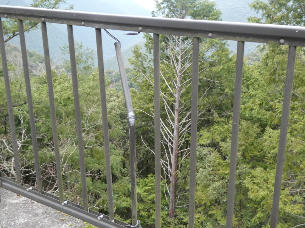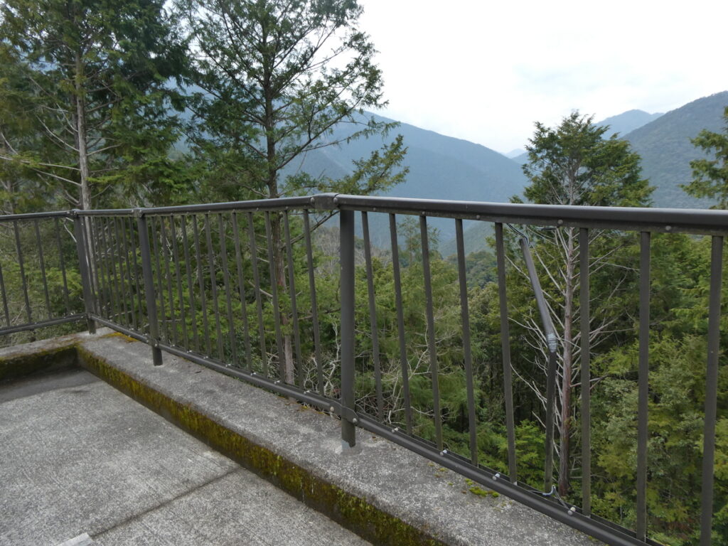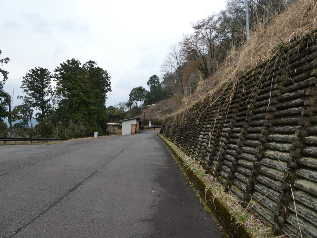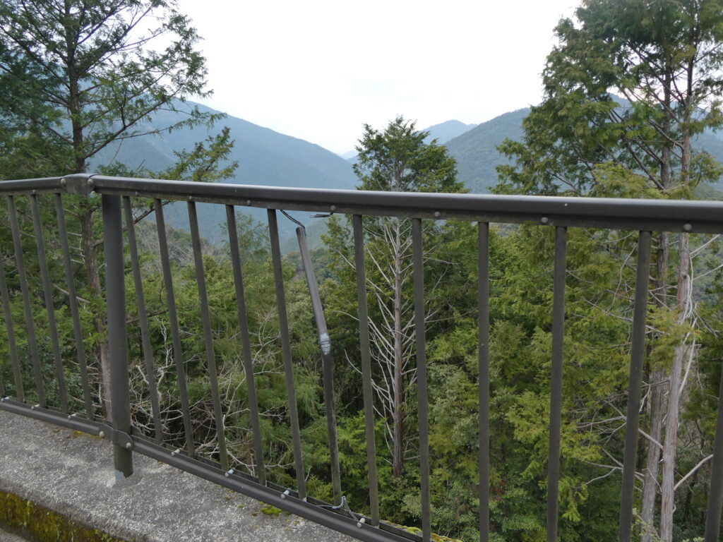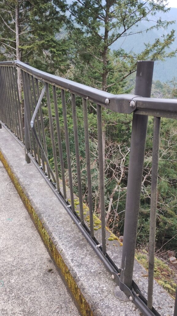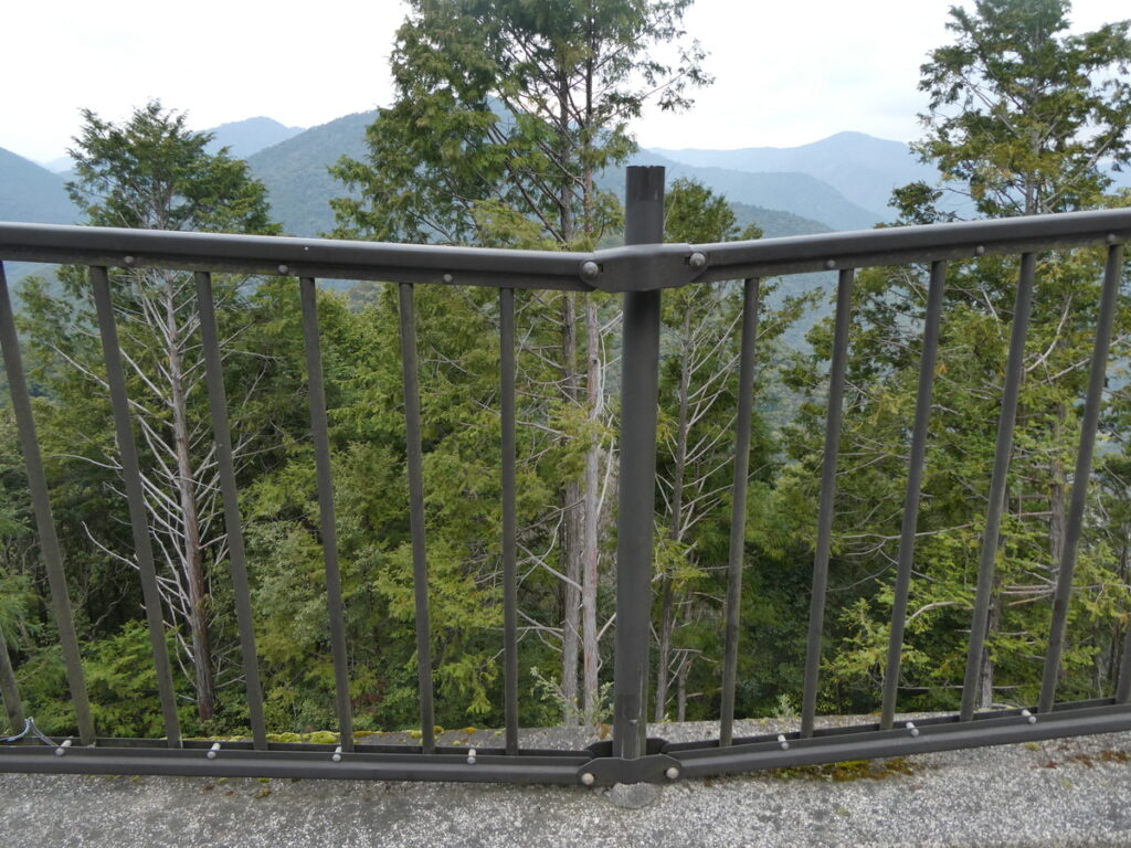 対向車が来ないことを祈りながら…細いくねくねした山道をどこまでも登っていく。のぼった先には、数台分の観光者用の無料駐車場がある。駐車場奥のフェンスの鉄棒の一部が不自然な感じで折れ曲がり変形している。誰かが車で誤って破壊した跡のようだ。