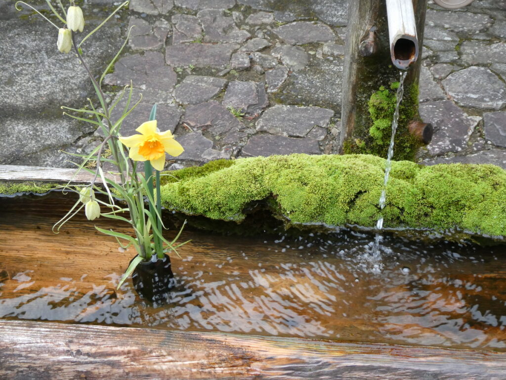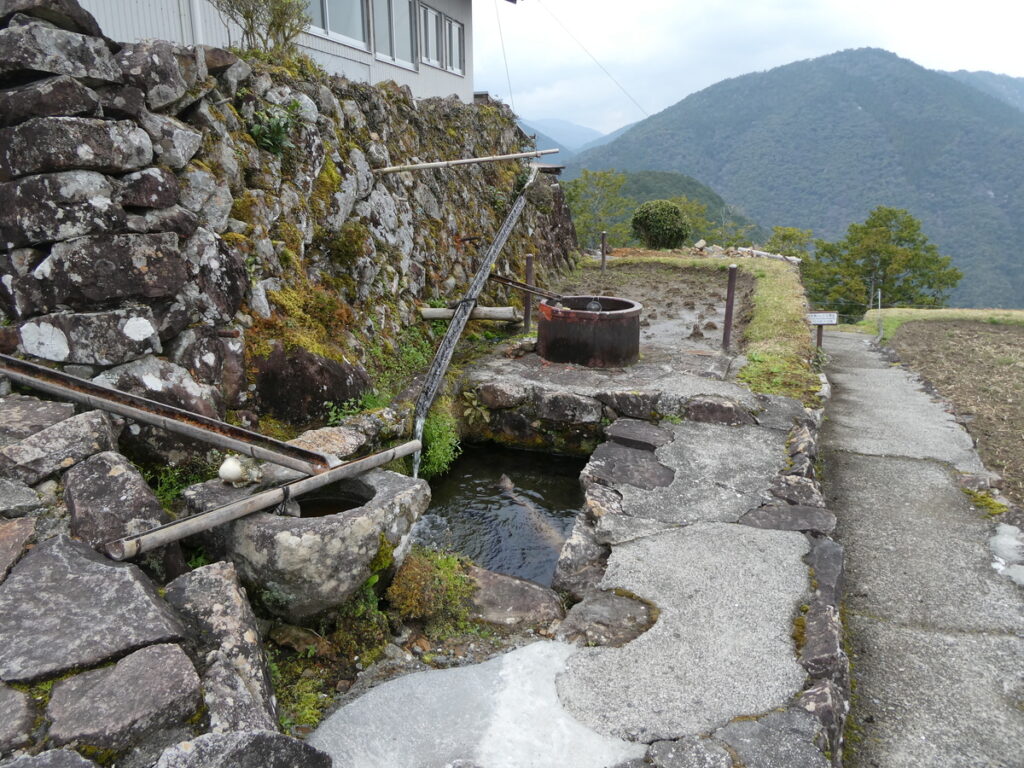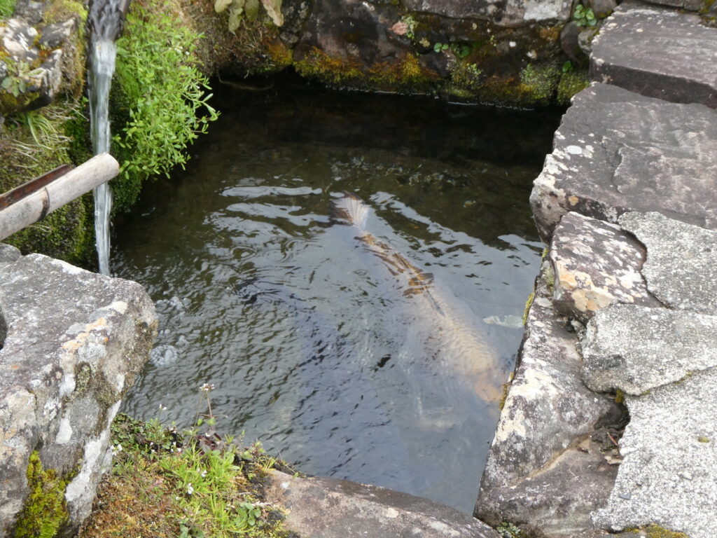 水を引き込んだ小さな生簀があった。生簀ではなく石で囲って造ったペット用の水槽なのかもしれない。丸々と太った大きな鯉が窮屈そうにいた。