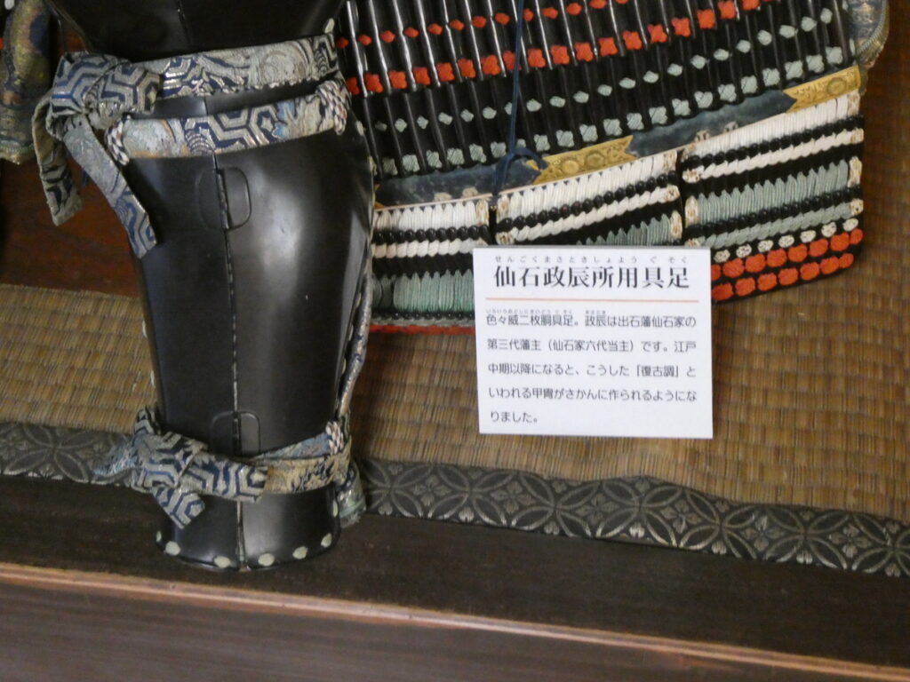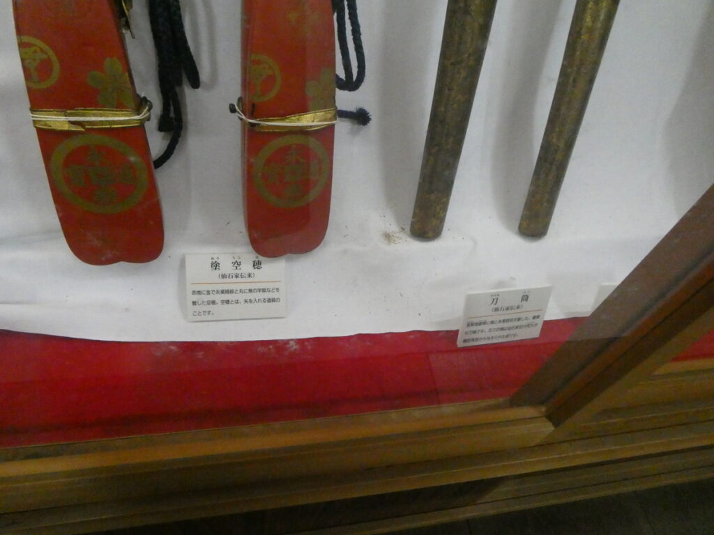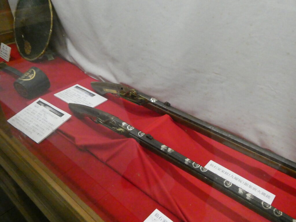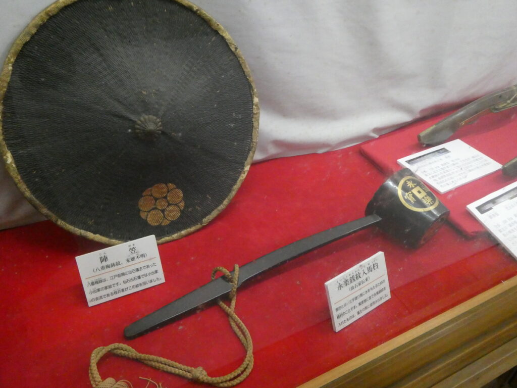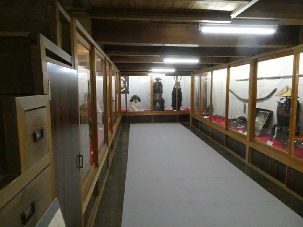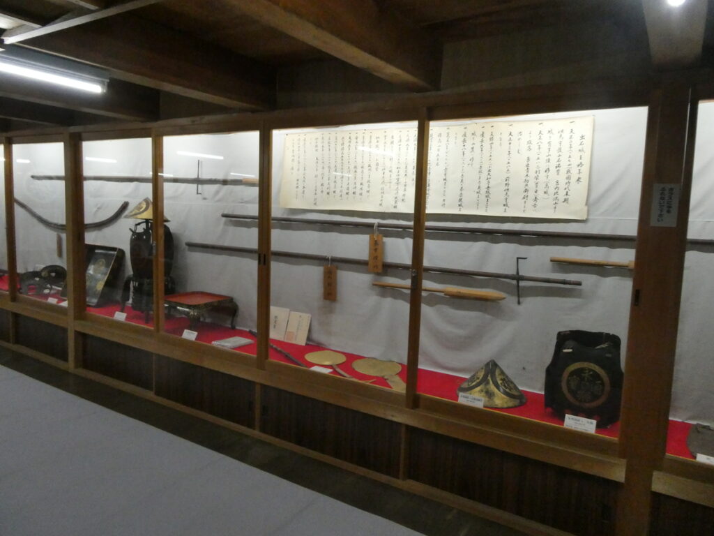 迷路のような建物を進むと土蔵に至る。内部は展示室となっており、仙石家ゆかりの品々が展示されている。陣太鼓、陣笠、永楽銭紋入二枚胴、金箔押軍配団扇などのほか、仙石秀久ゆかりの武具も並ぶ。火縄銃が発見された際、磨き直したところ仙石家の家紋が現れたという新聞記事も展示されており、興味深い。