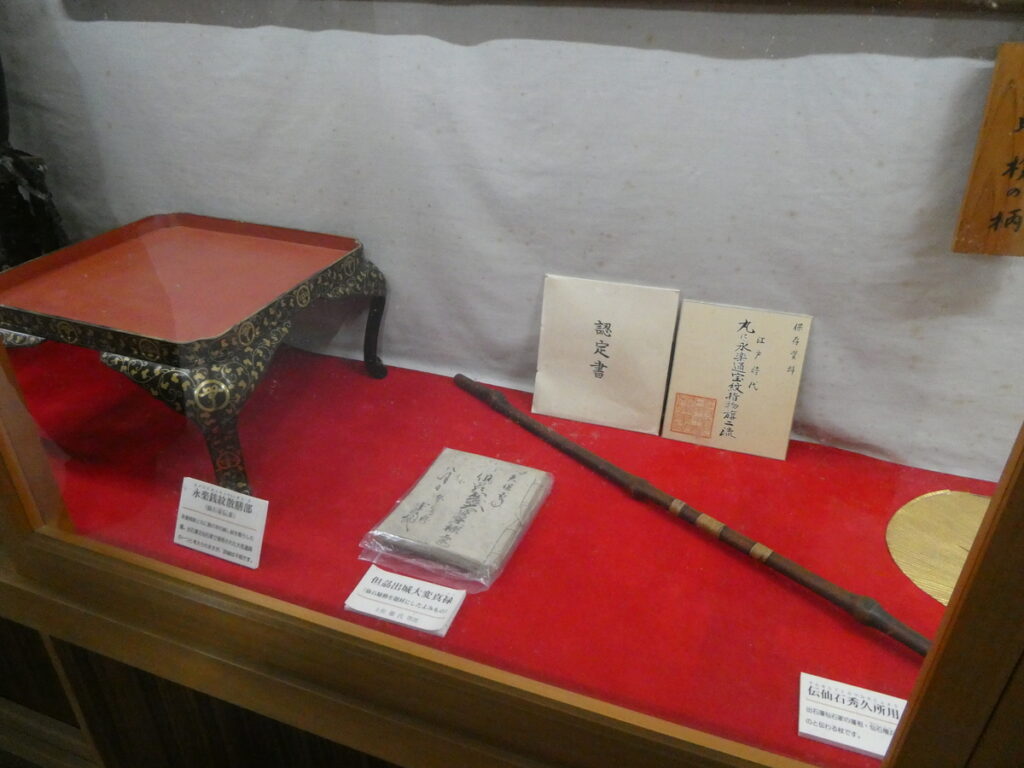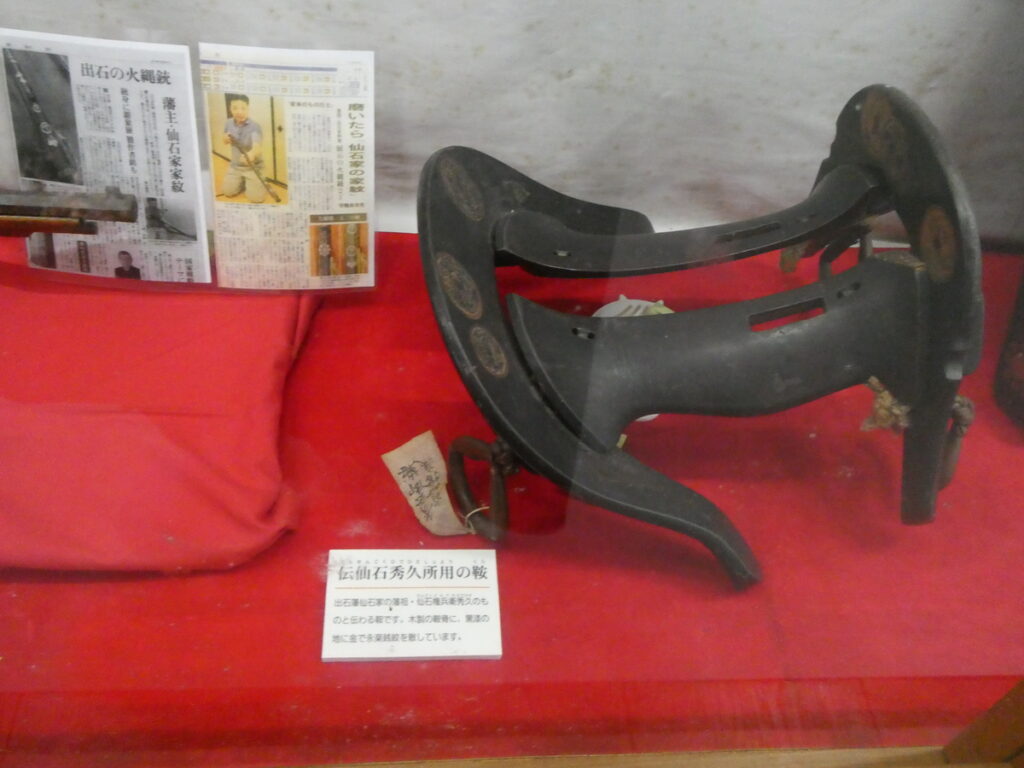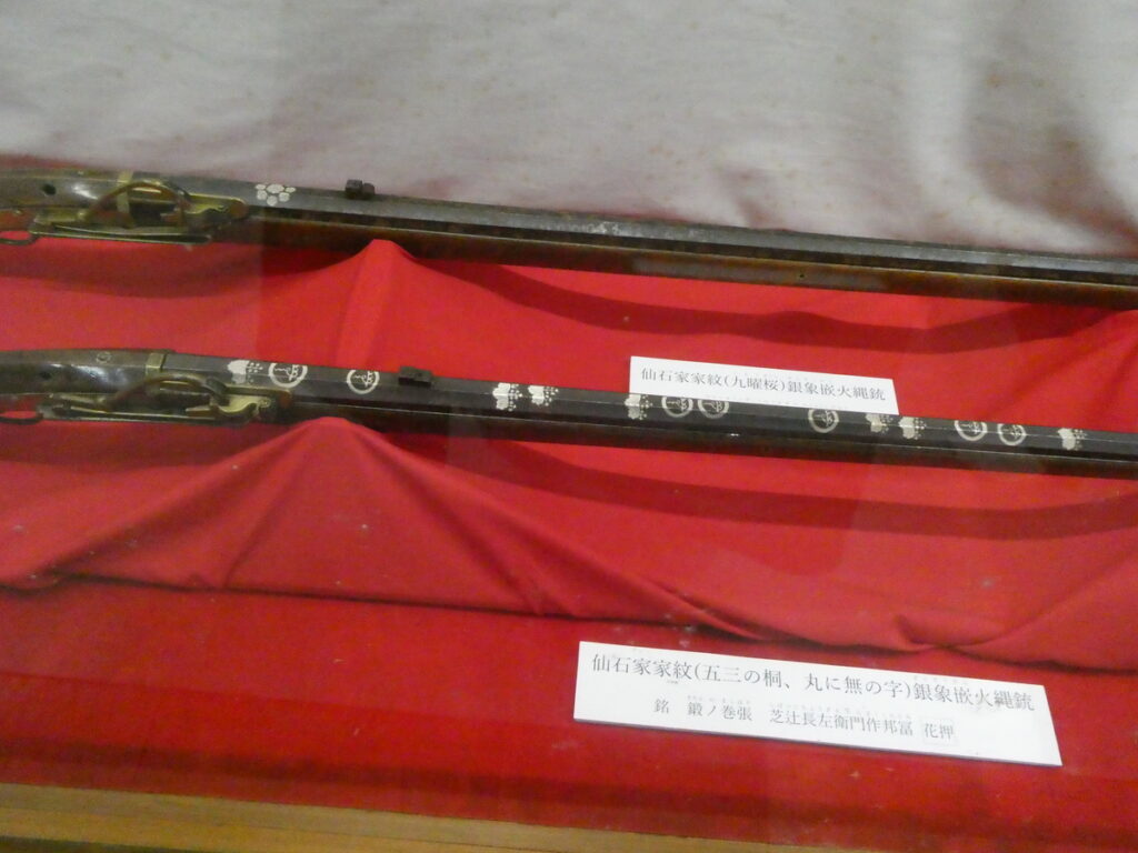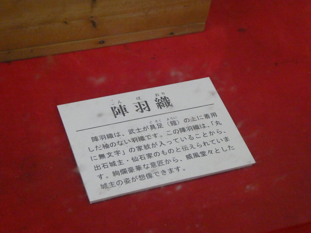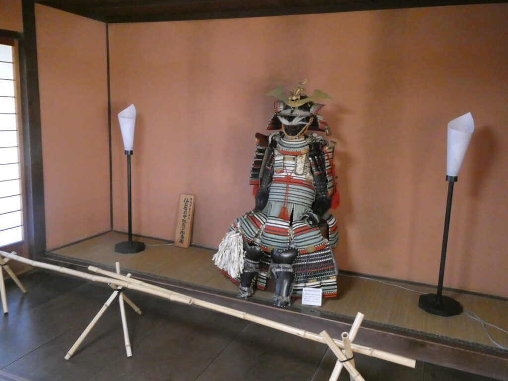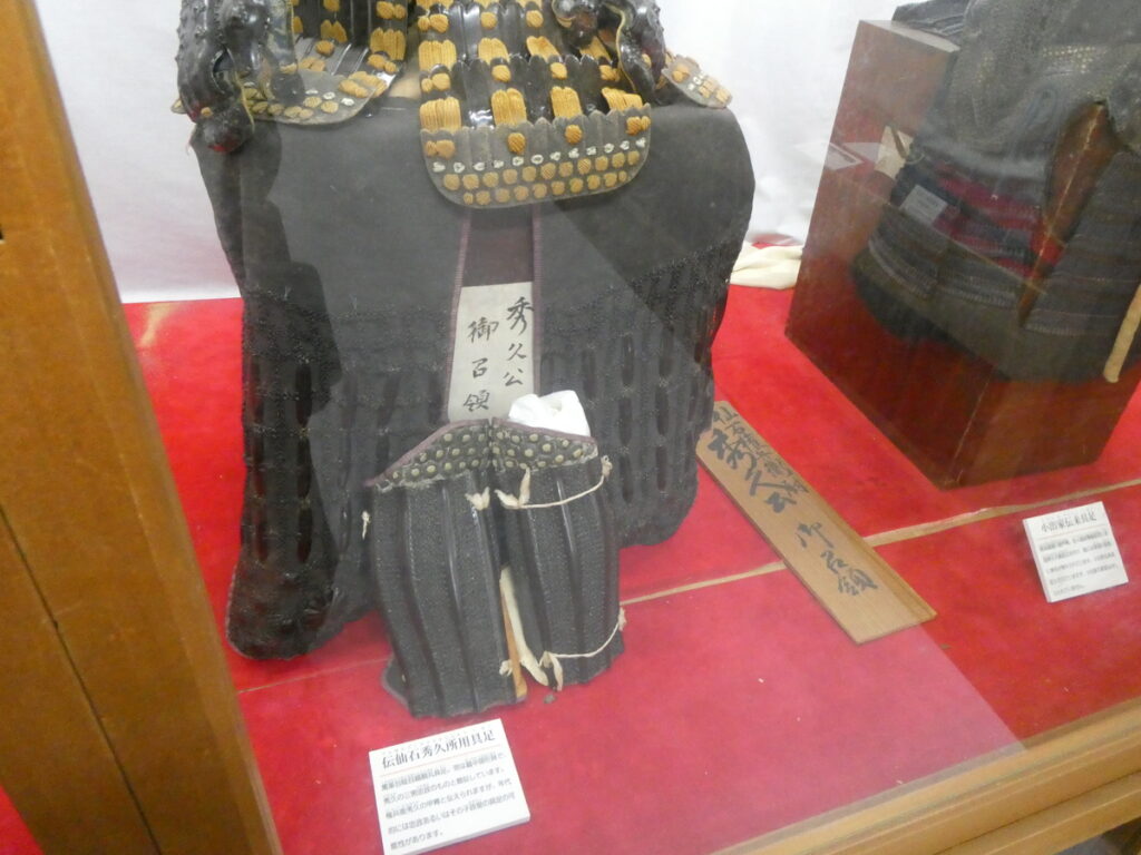 迷路のような建物を進むと土蔵に至る。内部は展示室となっており、仙石家ゆかりの品々が展示されている。陣太鼓、陣笠、永楽銭紋入二枚胴、金箔押軍配団扇などのほか、仙石秀久ゆかりの武具も並ぶ。火縄銃が発見された際、磨き直したところ仙石家の家紋が現れたという新聞記事も展示されており、興味深い。