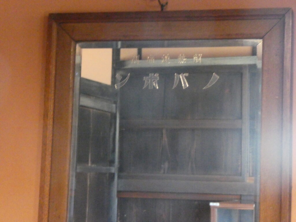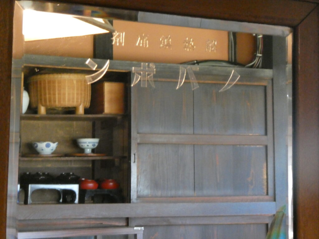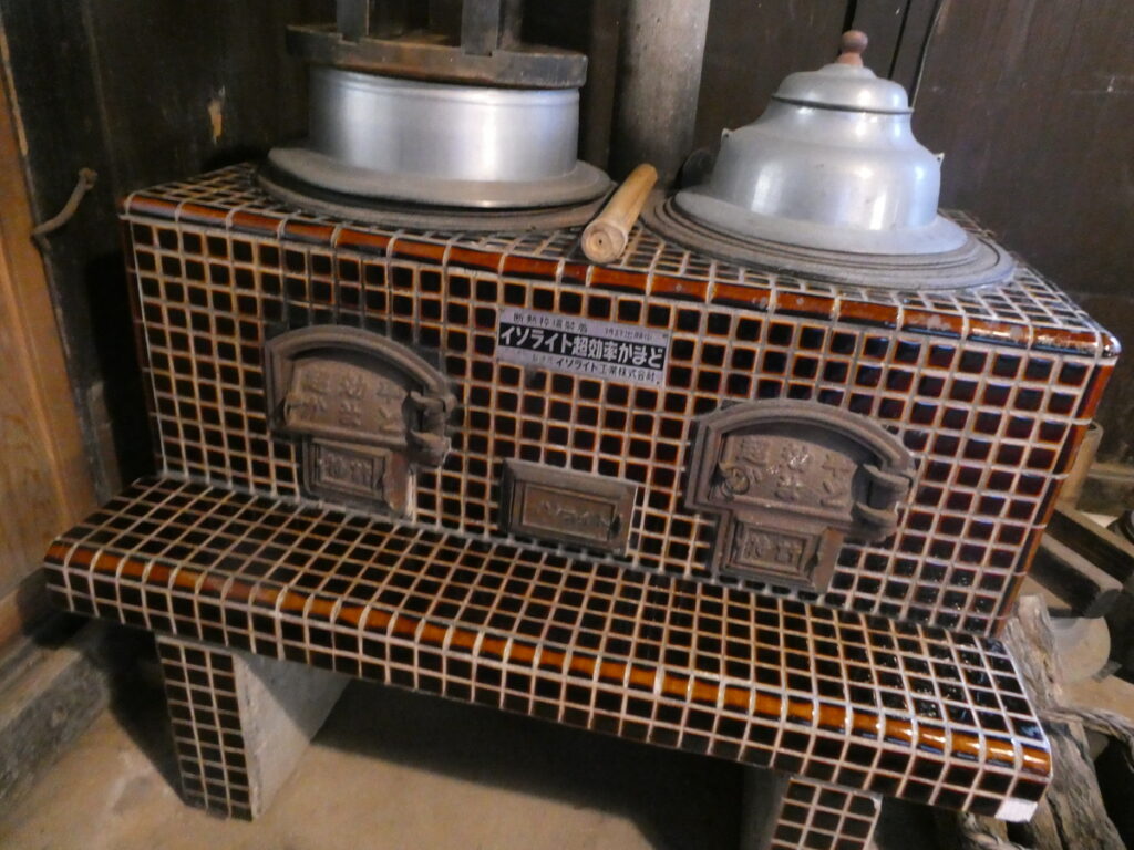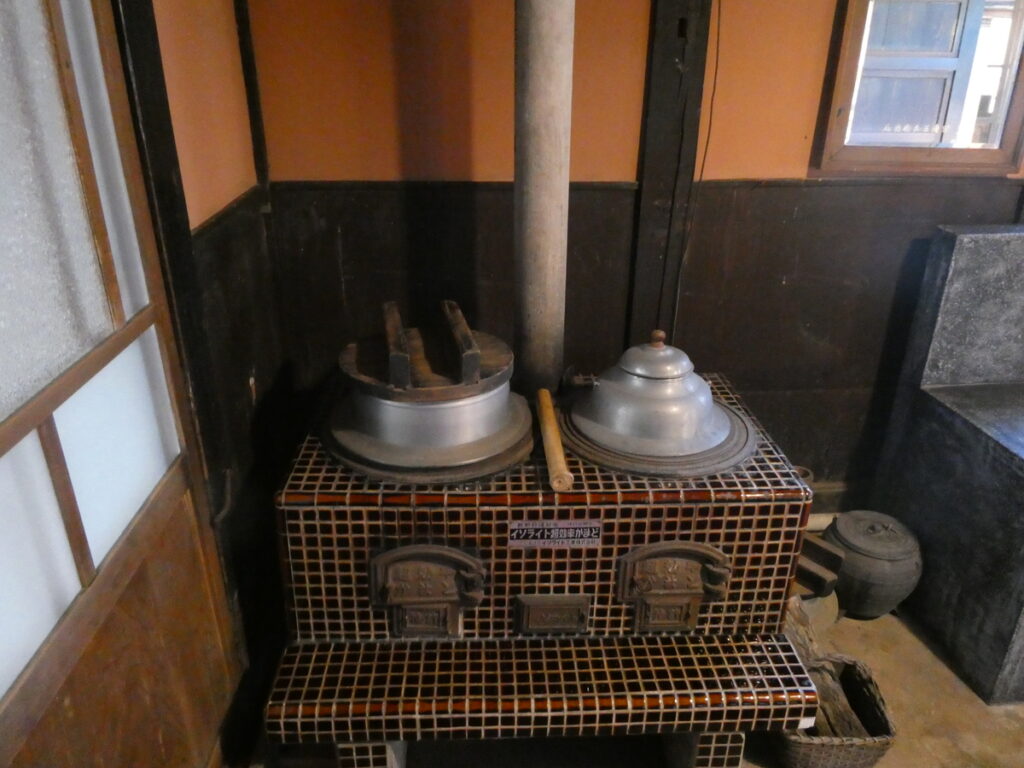 台所には当時の生活を感じさせる展示も残されており、右読みの「解熱鎮痛剤ノバポン」と、左読みの「イソライト超効率かまど」という表記が並ぶ様子は、時代の過渡期を感じさせる。