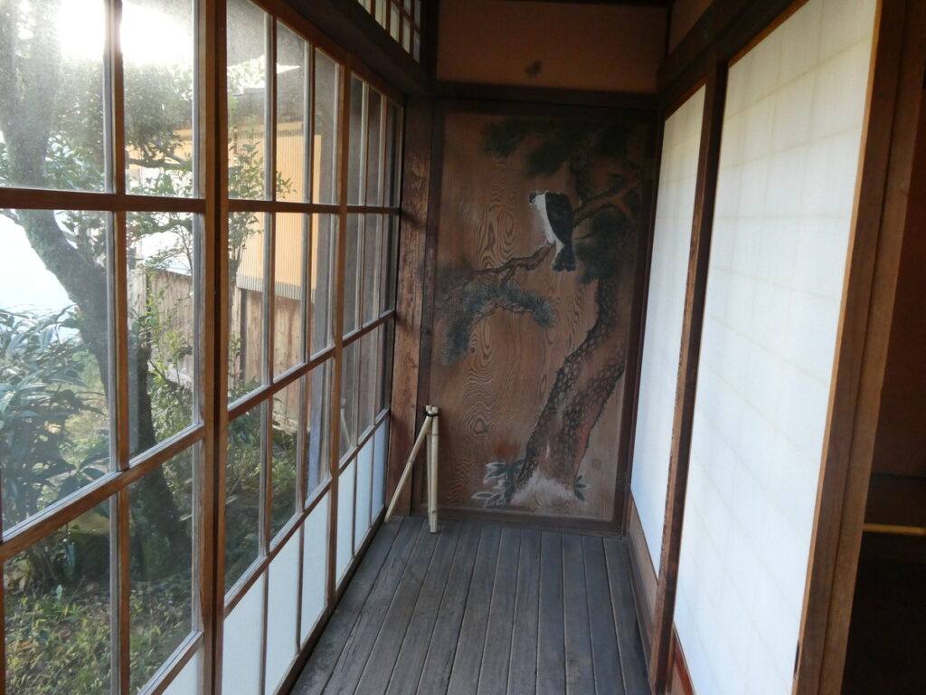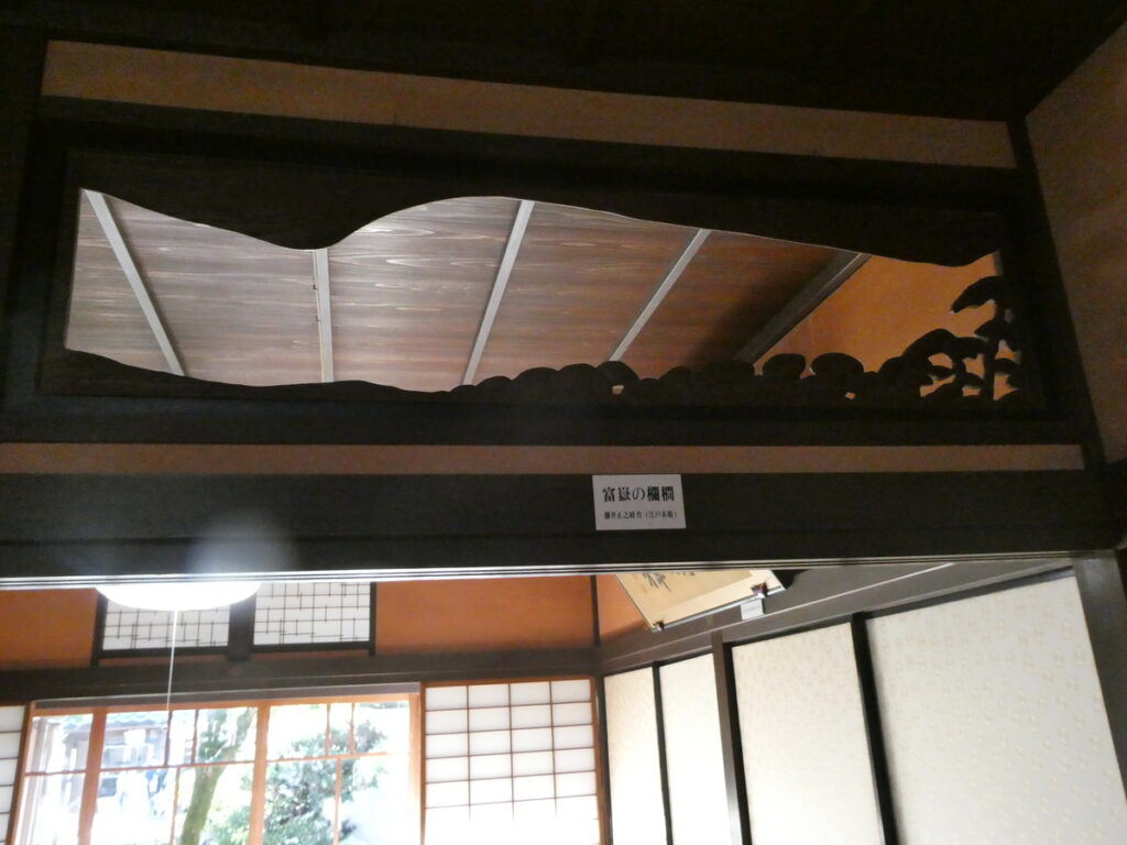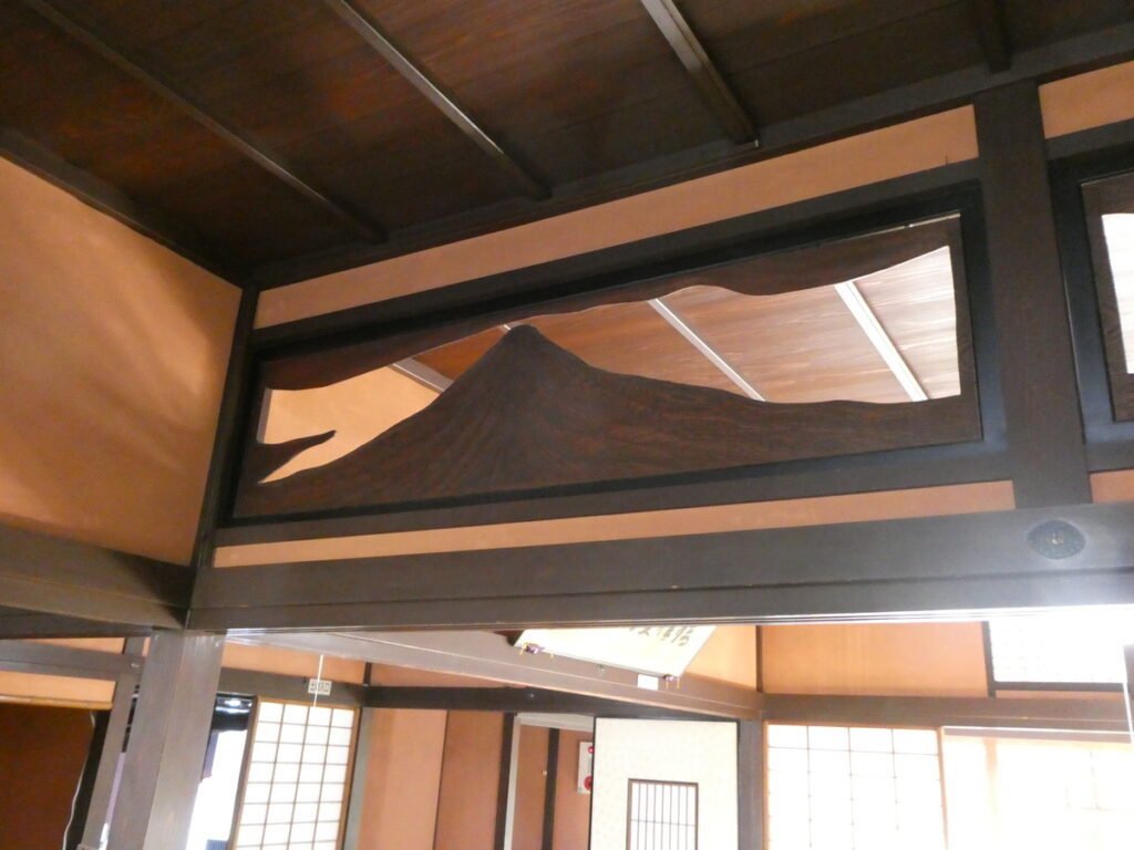 縁側突き当たりの壁に描かれた絵や、富嶽を題材にした欄間の意匠は、屋内にいながら自然を感じさせる。床の間や天袋の襖絵も落ち着いた中に華やかさがあり、梁に施された鳥を模した鎹など、細部にまで意匠が凝らされている。