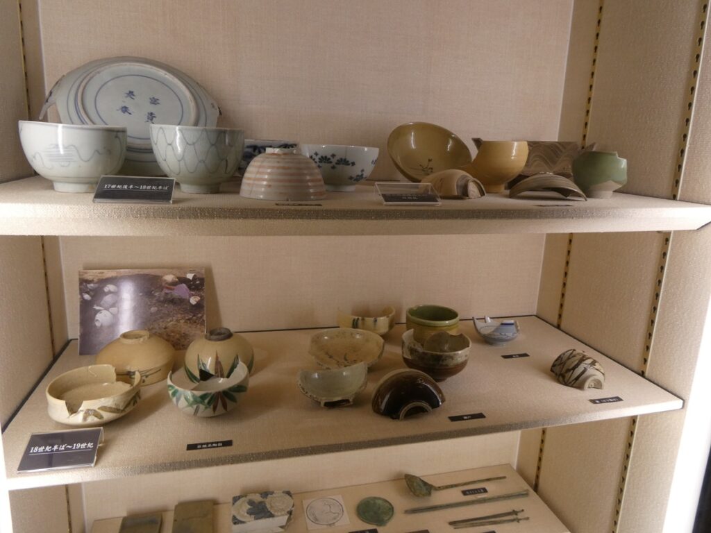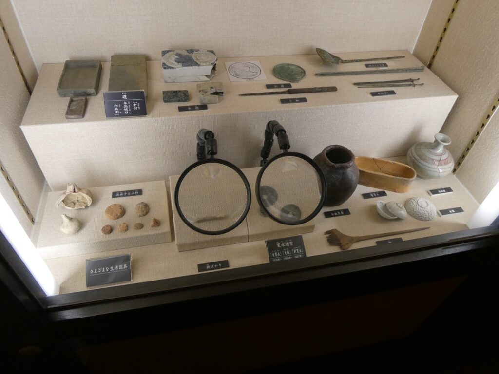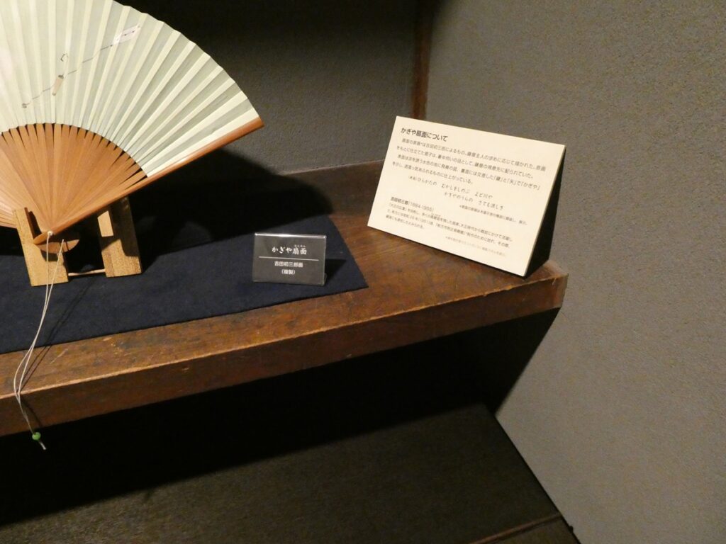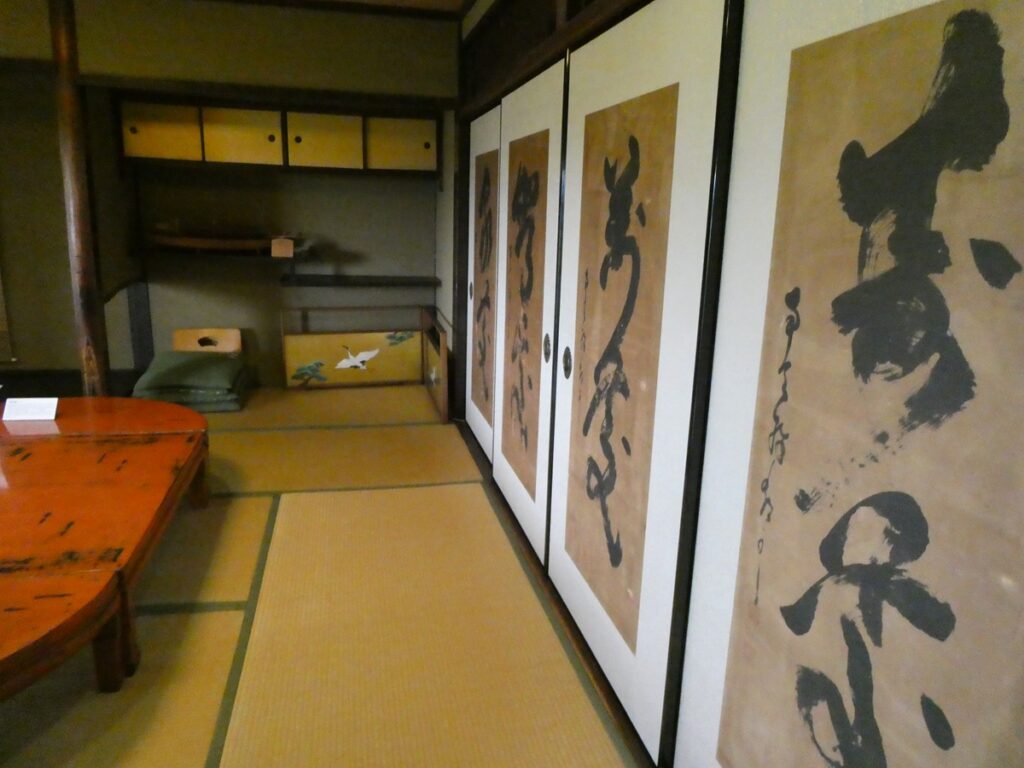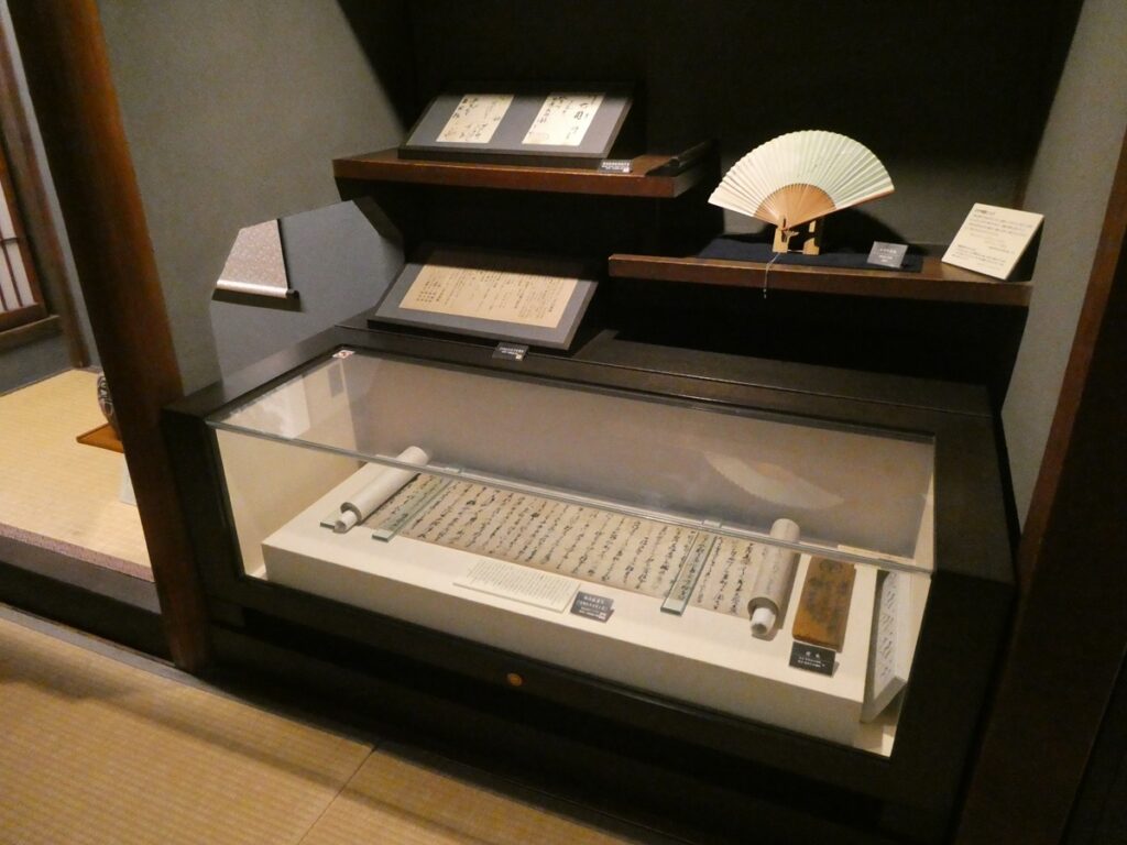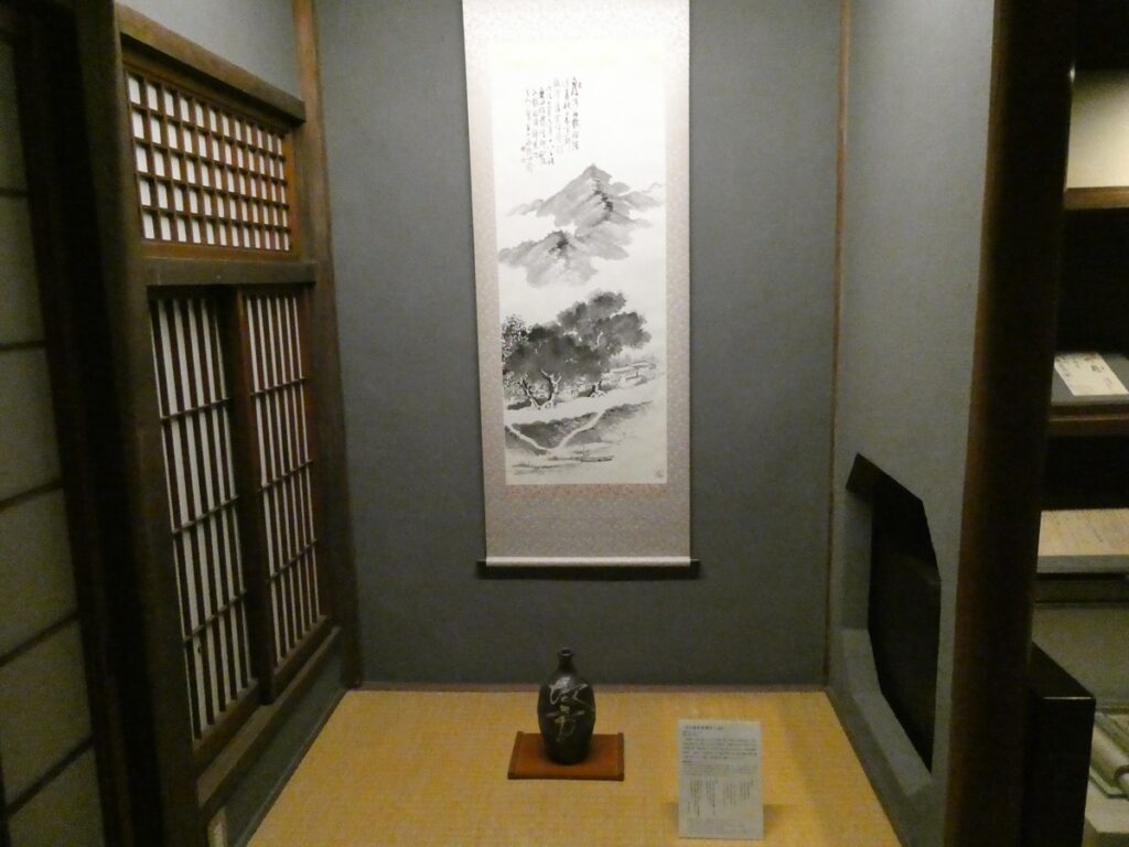館内には当時の書や食器、生活道具が展示されている。
