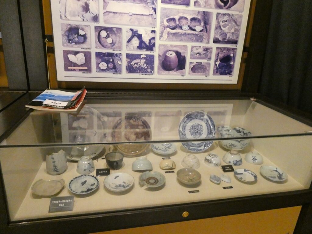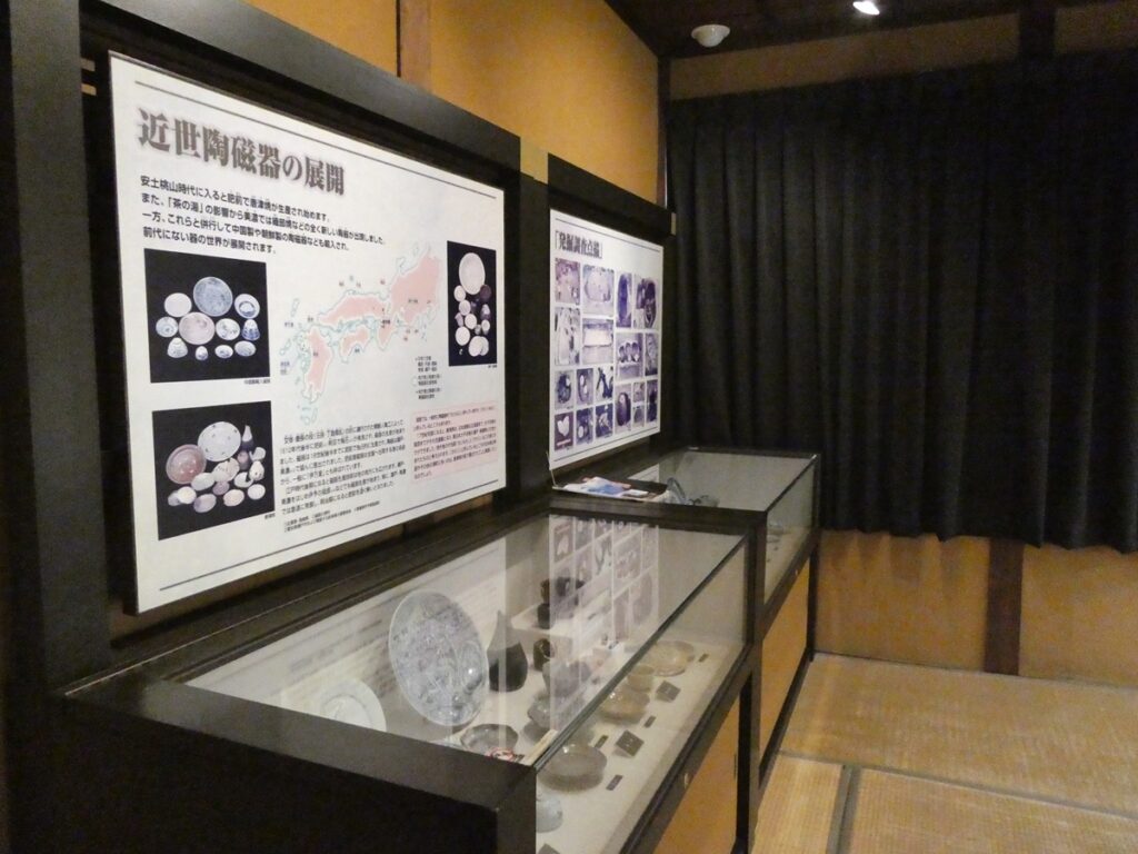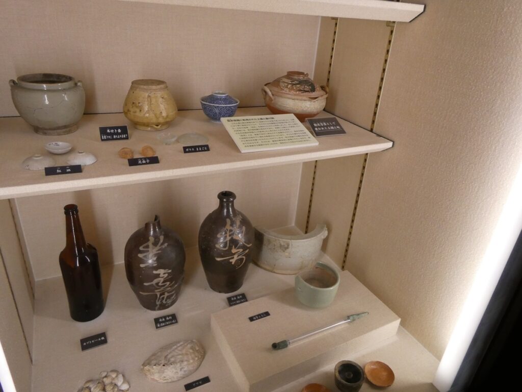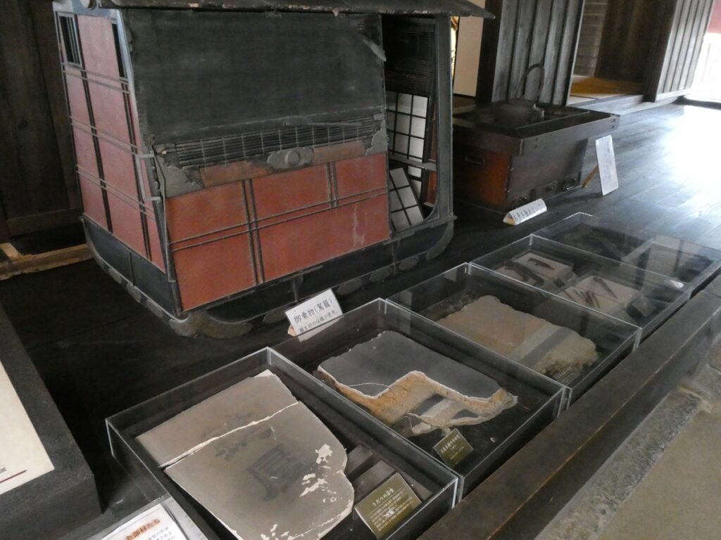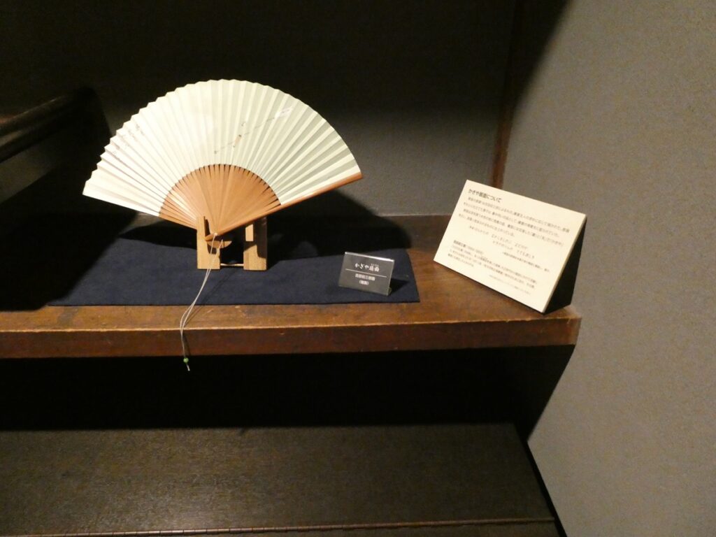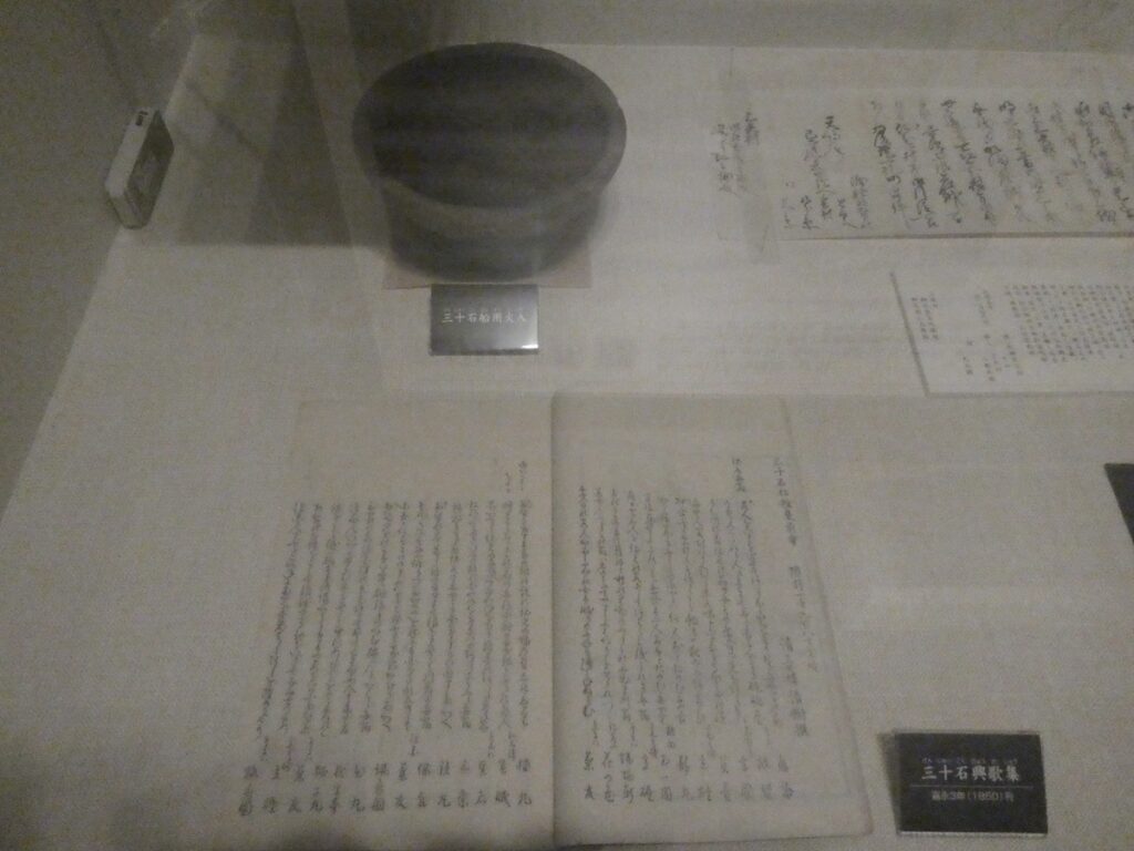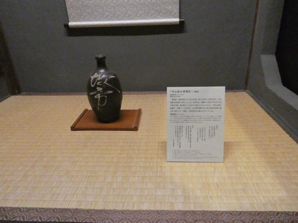 館内には当時の書や食器、生活道具が展示されている。