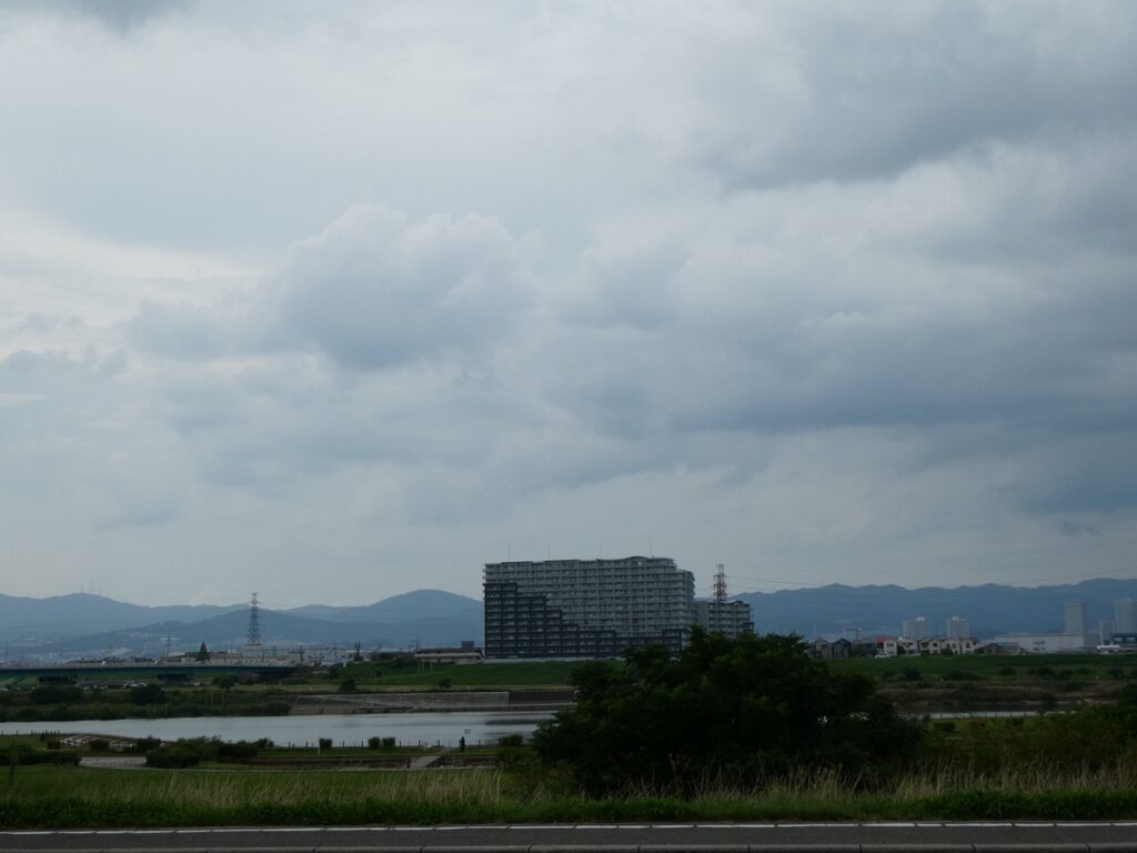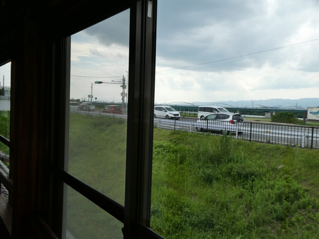 窓の外には堤防の上の車の流れ、その向こうに広がるのは淀川の青。