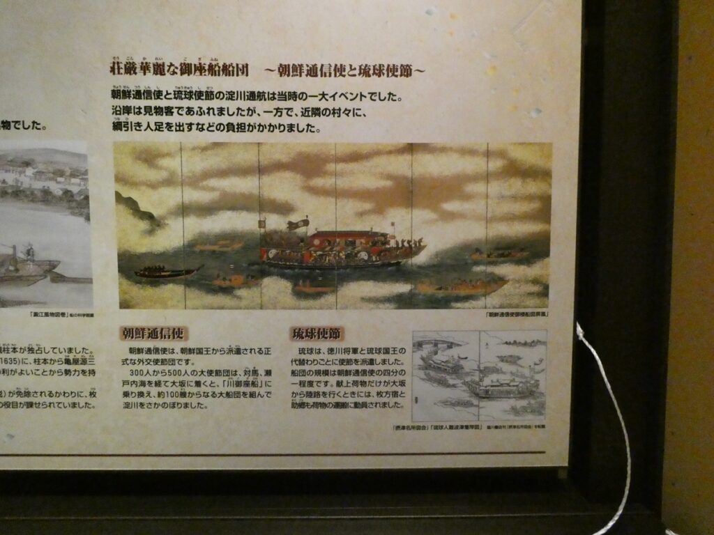 ときには500人を超える通信使が大阪から川御座船に乗り、淀川をのぼって江戸へ向かった。