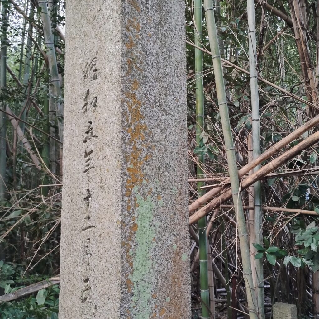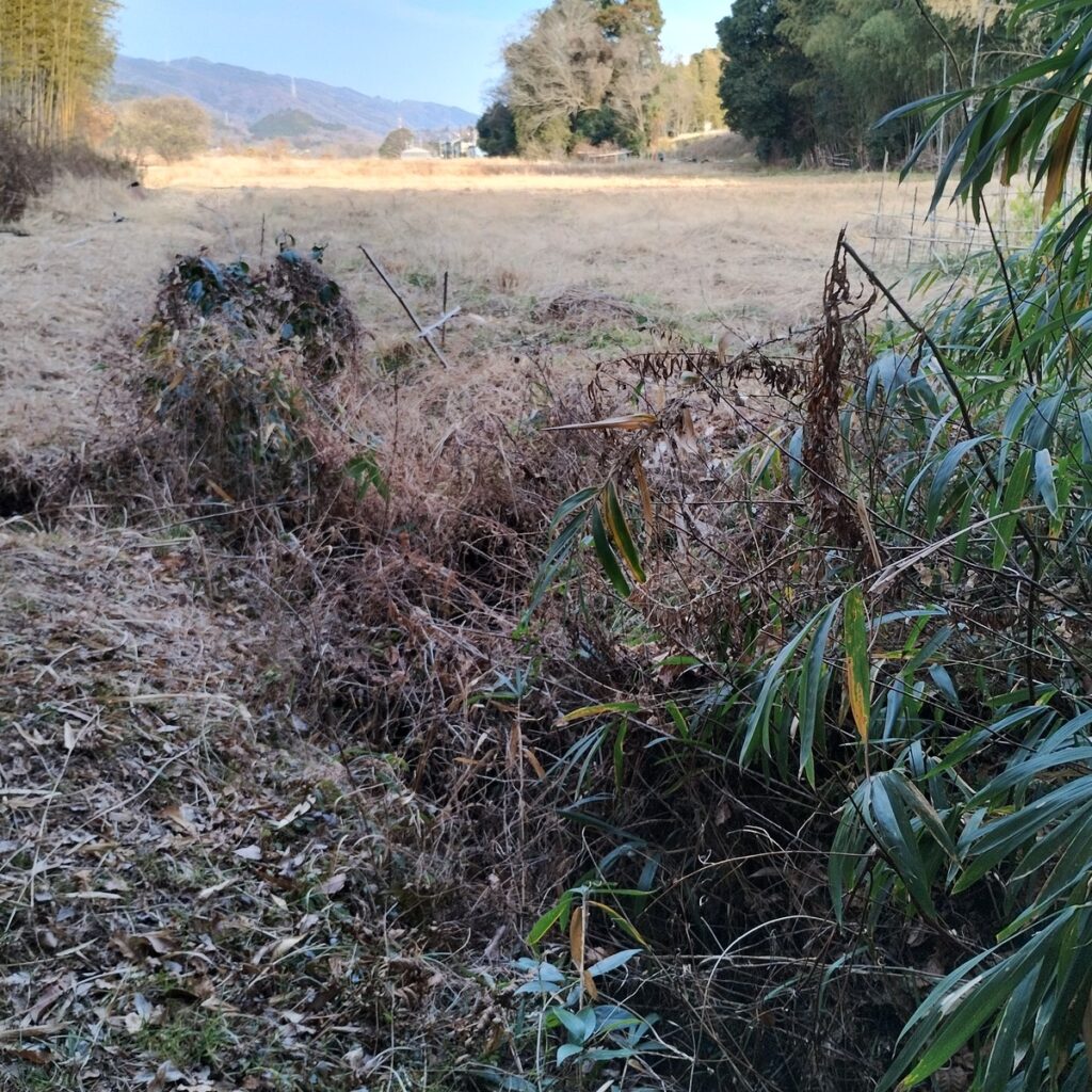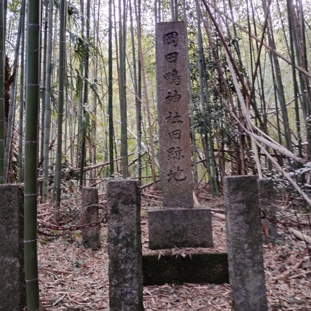 その周囲だけ綺麗に刈り取られた竹藪の中に「岡田鴨神社旧社地」と彫られた石碑があった。氏子さんたちが昭和5年に建てたものだ。その石碑の奥は足が踏み入れられないような竹藪。夏には畑や草原に草が生い茂り、ここまでたどり着くどころか分け入ることもできず岡田鴨神社周辺から眺める事しかできないという。