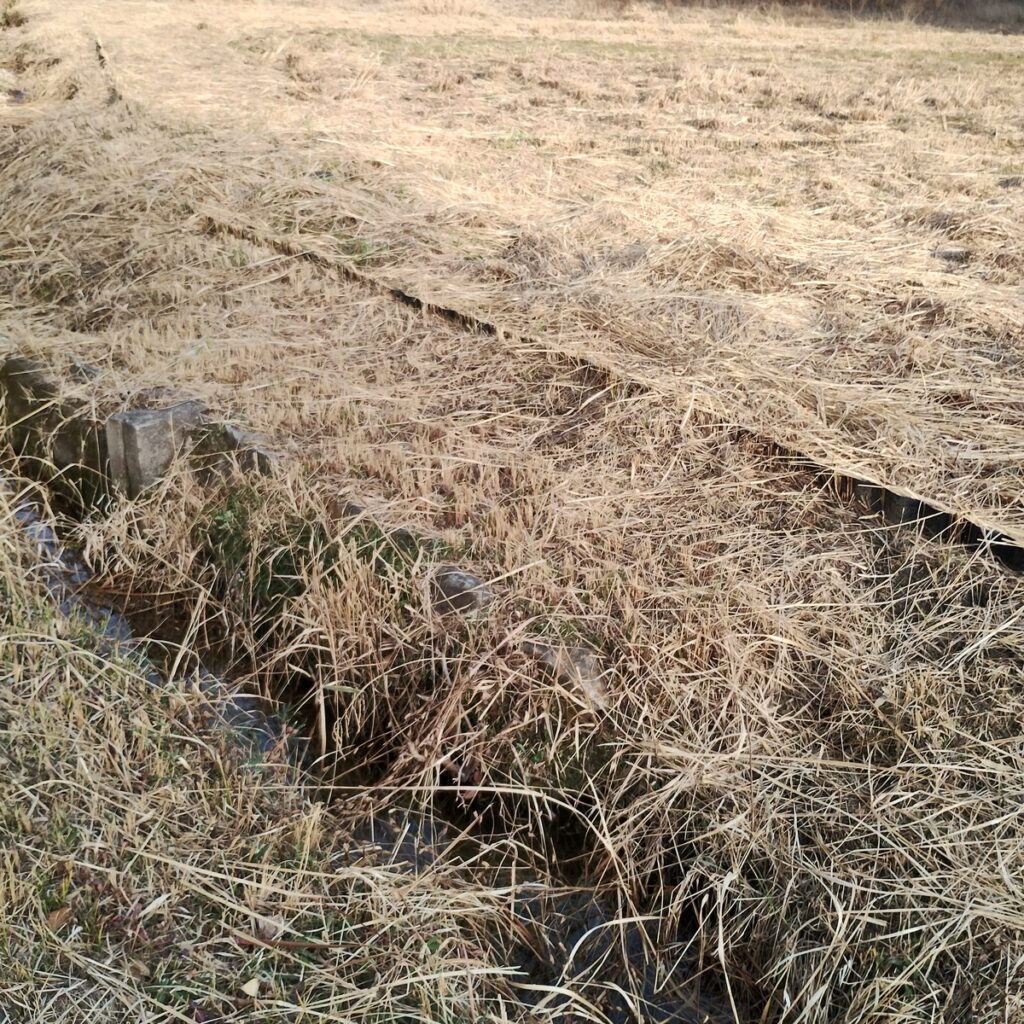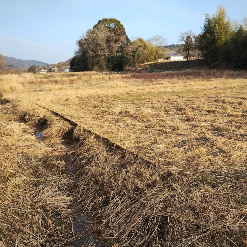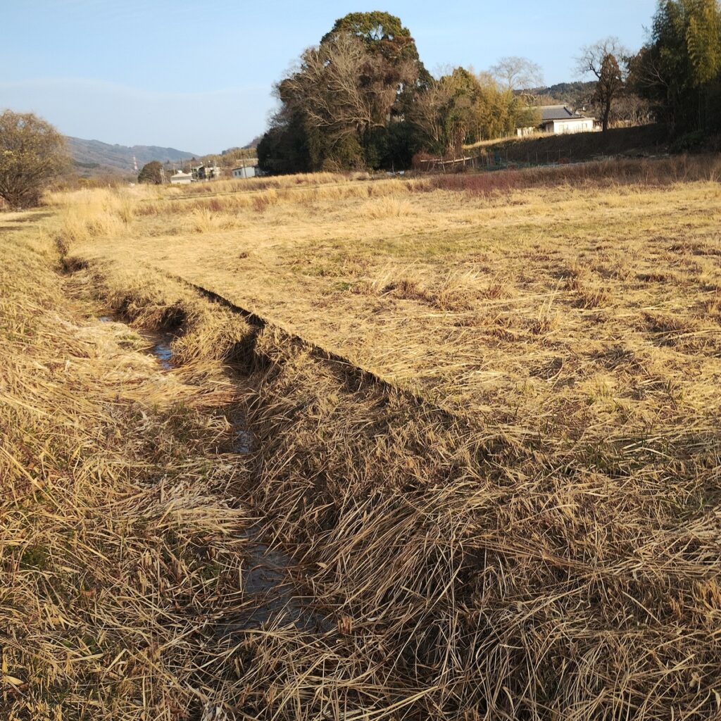 畑と草原の間を通る用水路のような水流は、神社の清流として手水舎とかに使ってたらしい。