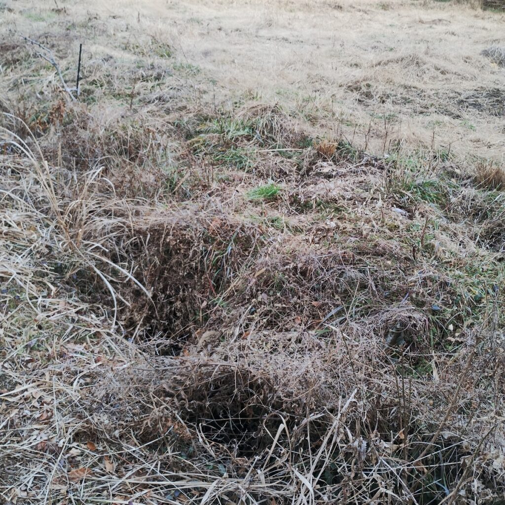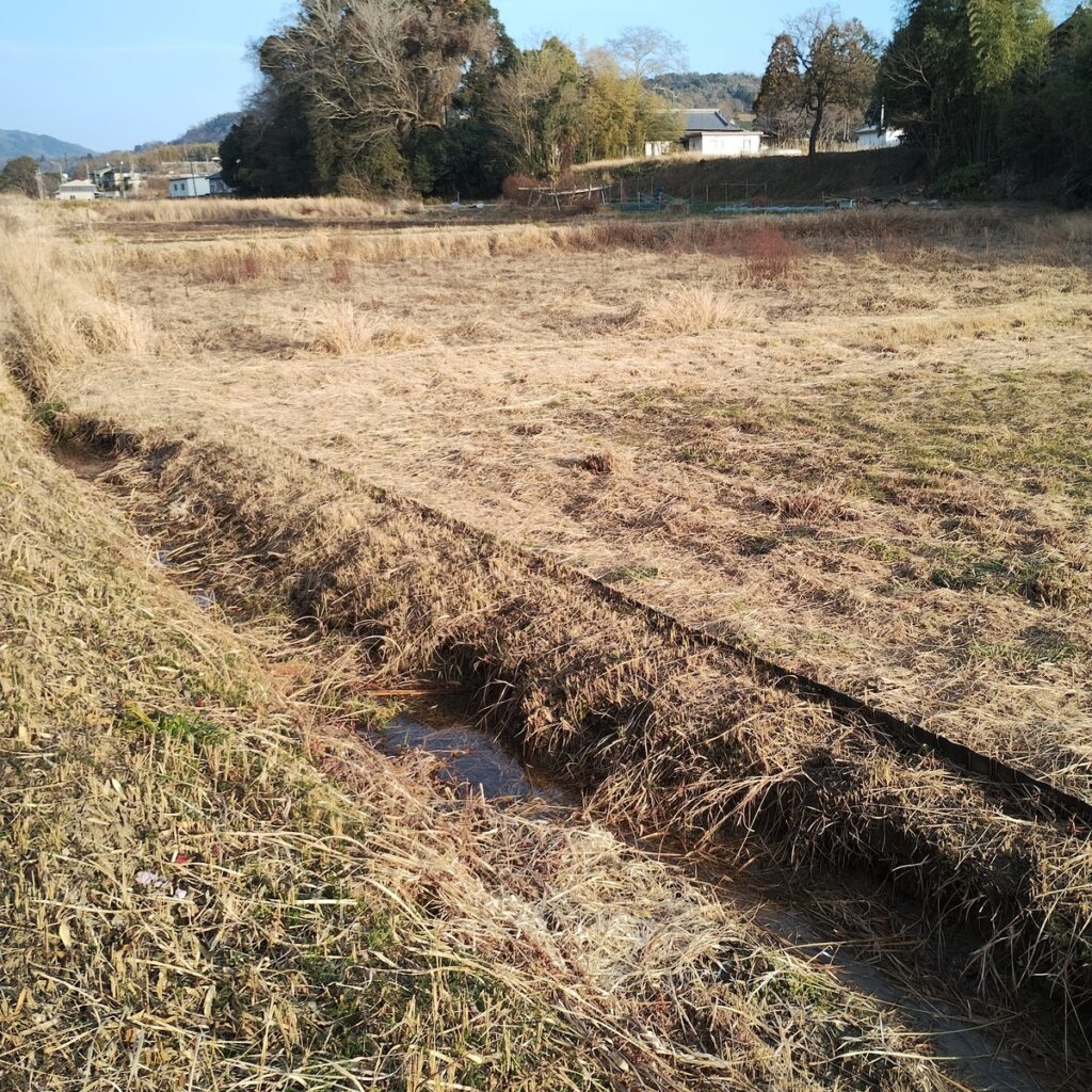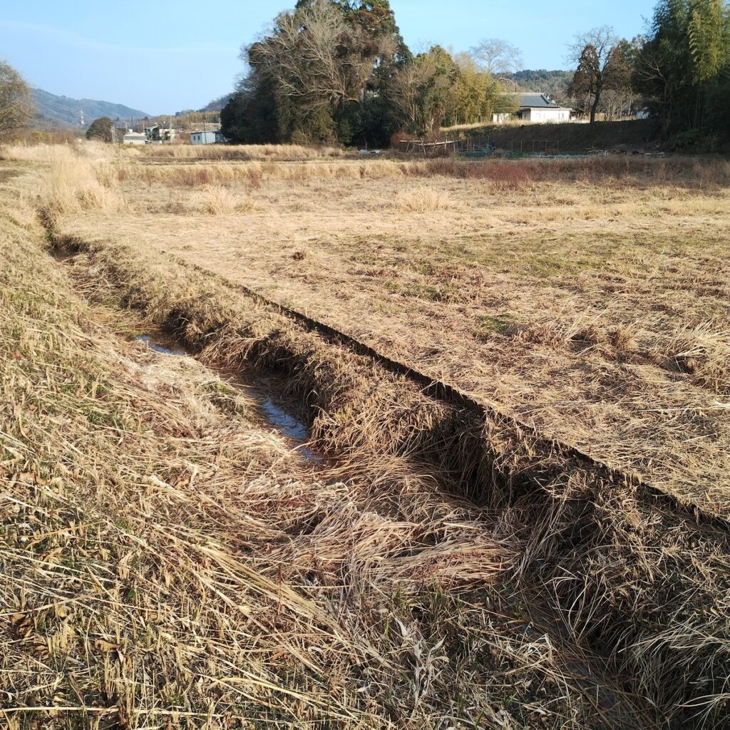 畑と草原の間を通る用水路のような水流は、神社の清流として手水舎とかに使ってたらしい。