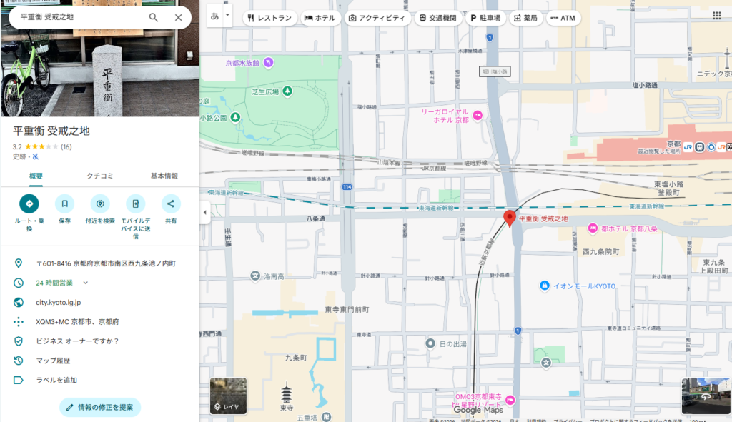 いまはビルやマンションが立ち並ぶこの一角も、平安後期には藤原家成の邸宅、「八条堀川の御堂」があったと伝わる。家成は平家と縁が深く、平清盛も出入りしていた人物だ。家成の死後も邸宅は遺族によって管理され、後に歴史の舞台となる。