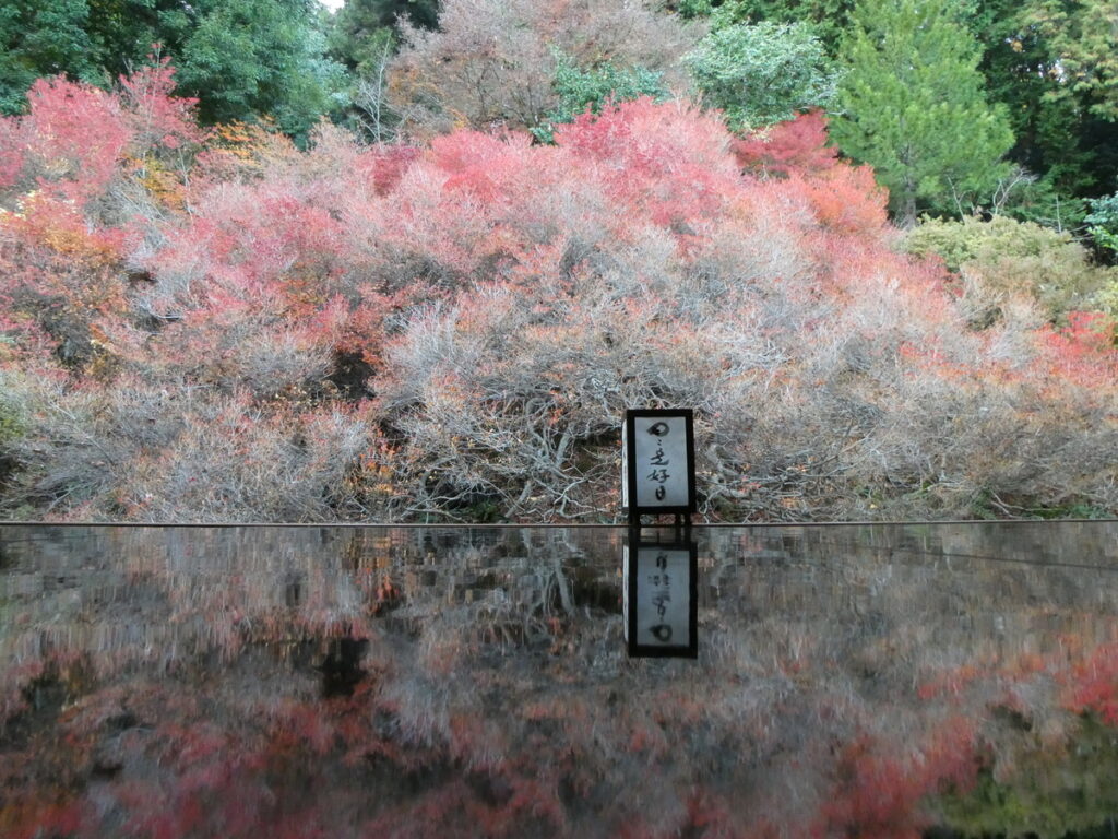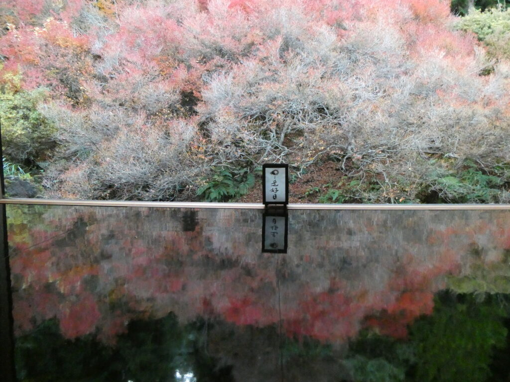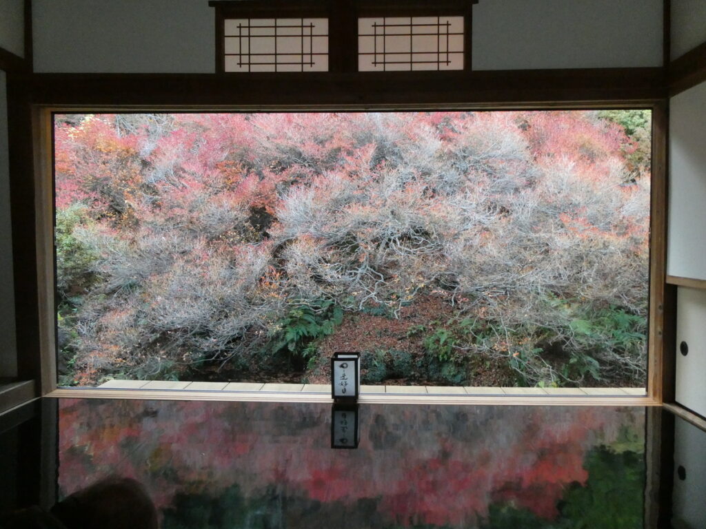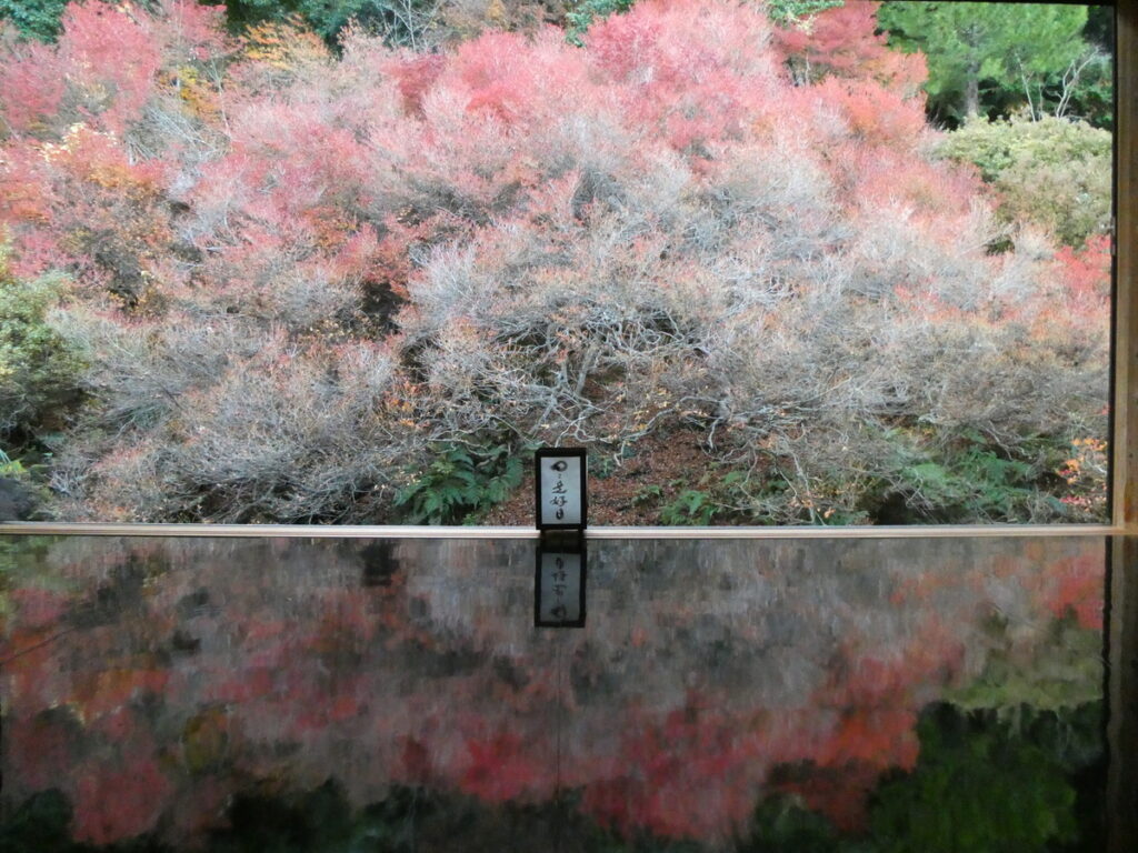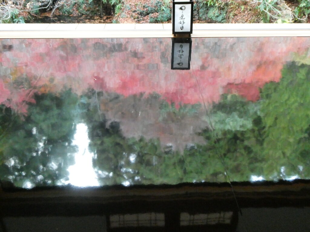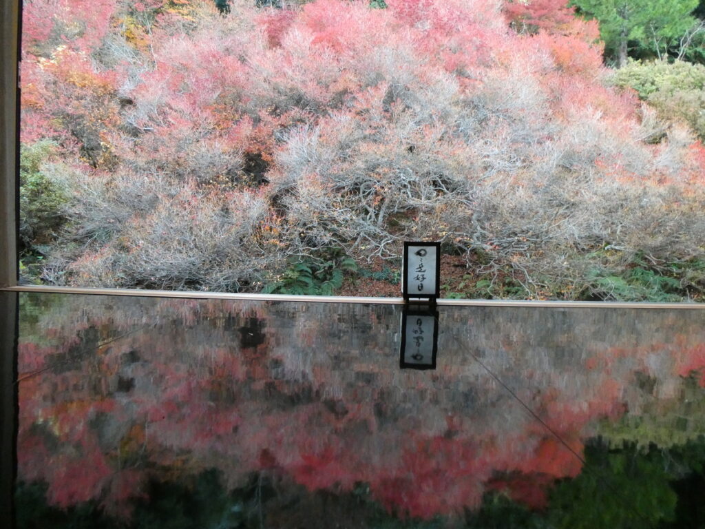 しかも境内はビックリするほど狭い!境内だけではない、本堂もビックリするほど小さい。そしてドウダンツツジの紅葉が見える所の戸が開け放たれ、床3分の1くらいに黒色のテカテカ光る板をおいている。この黒板があることで水面にうつった紅葉をみているかのような演出が完成している。