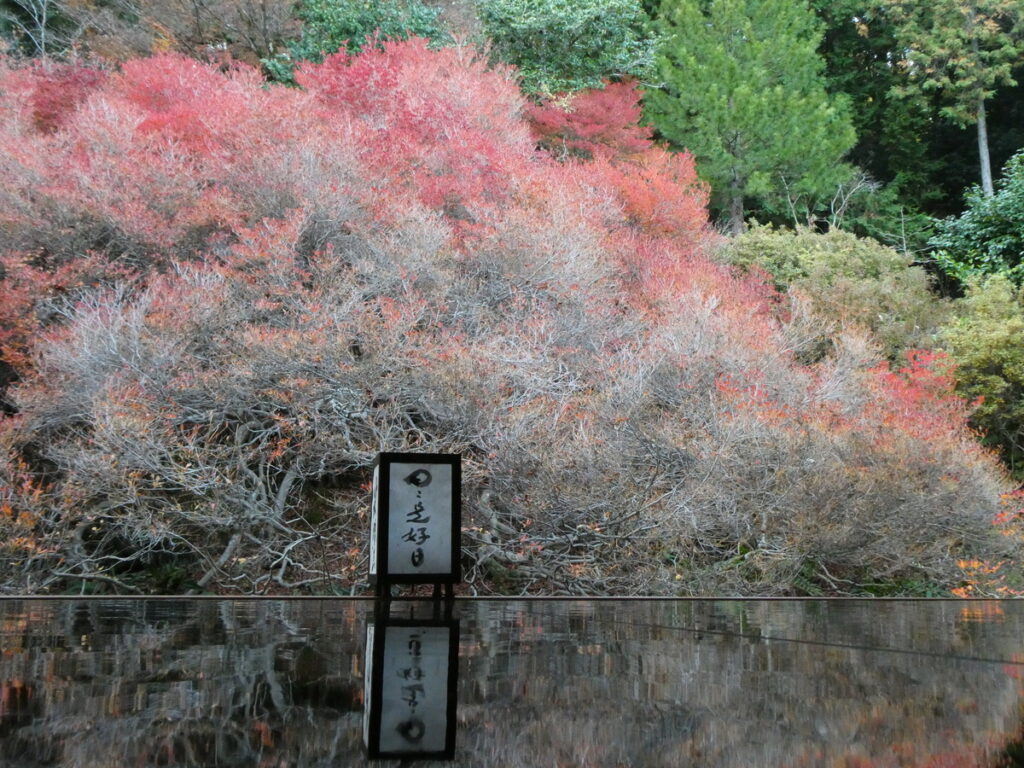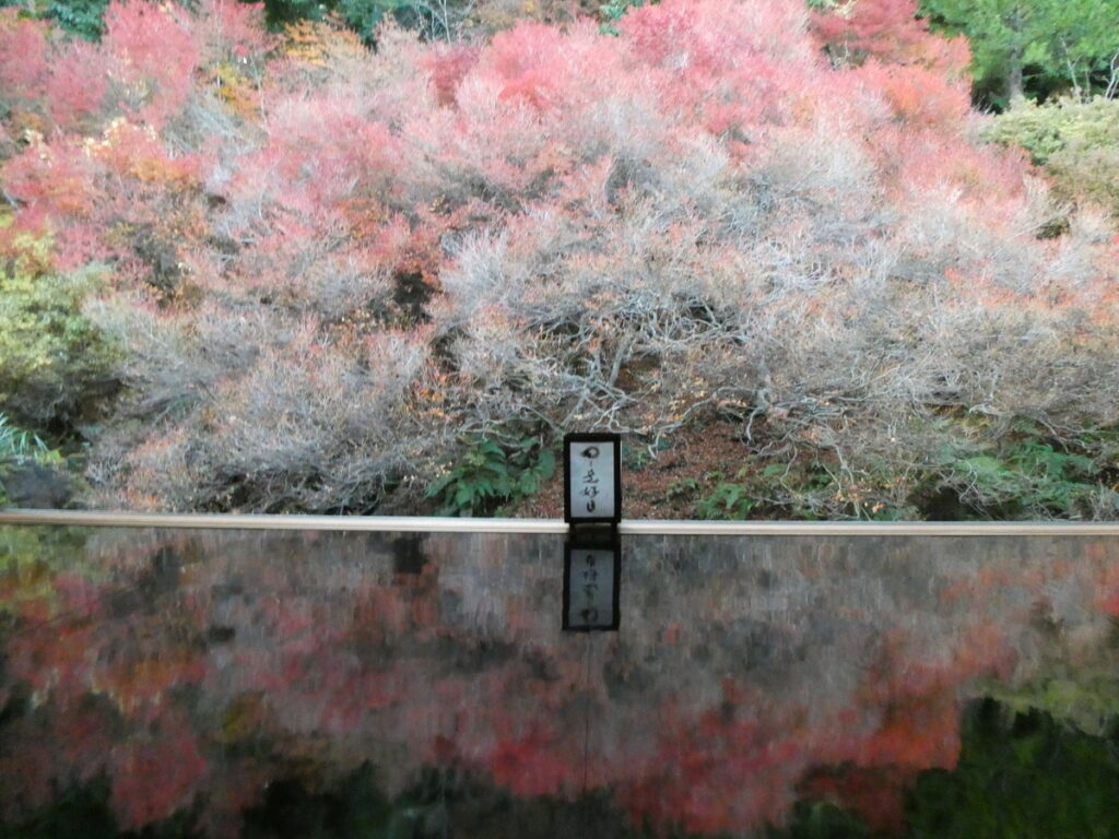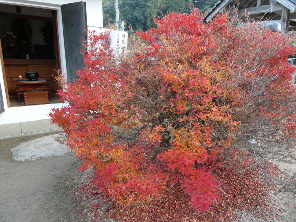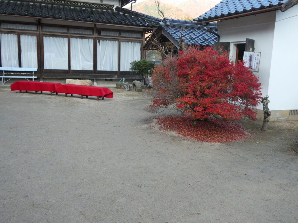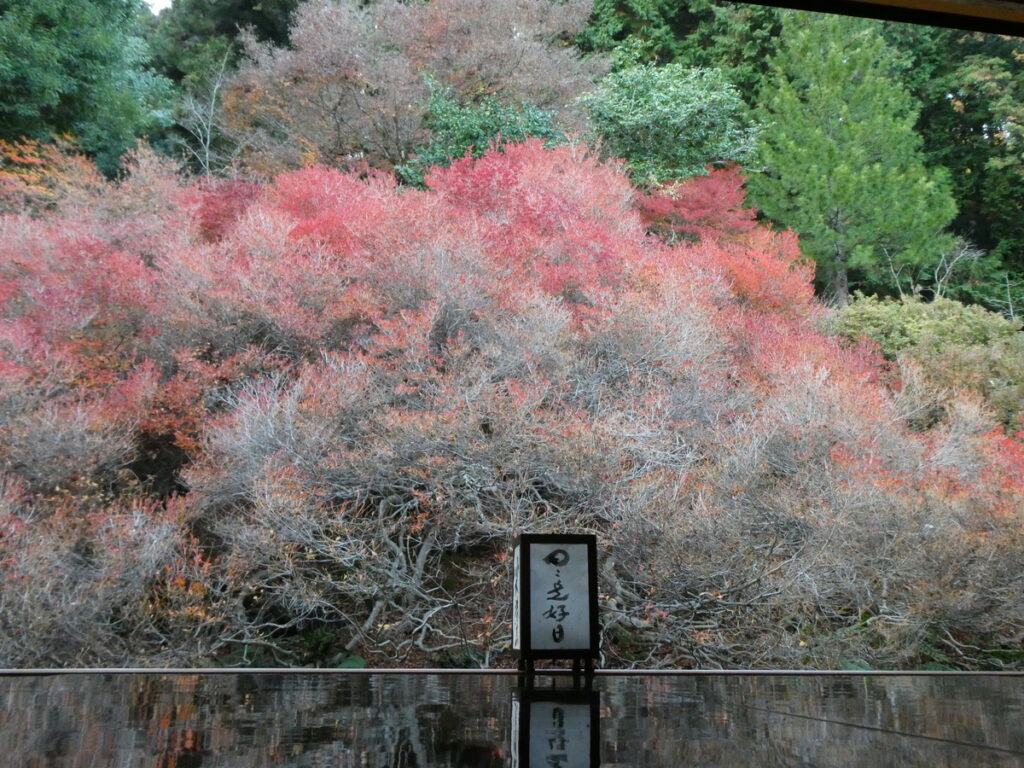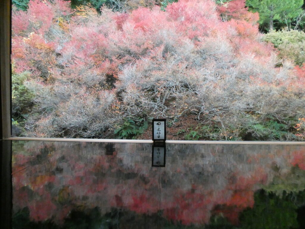 しかも境内はビックリするほど狭い!境内だけではない、本堂もビックリするほど小さい。そしてドウダンツツジの紅葉が見える所の戸が開け放たれ、床3分の1くらいに黒色のテカテカ光る板をおいている。この黒板があることで水面にうつった紅葉をみているかのような演出が完成している。
