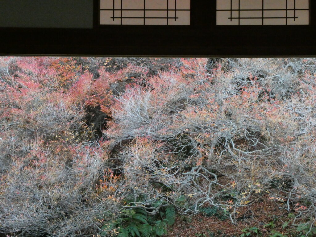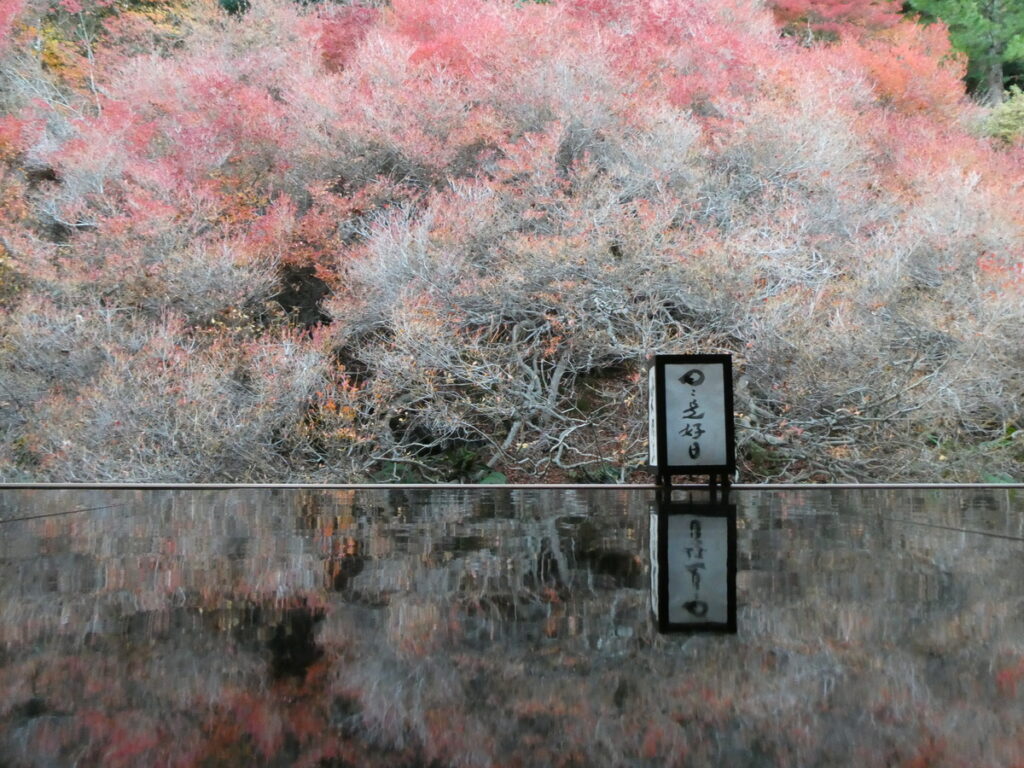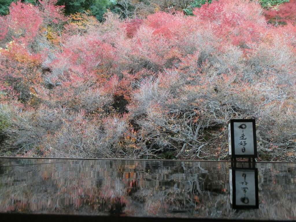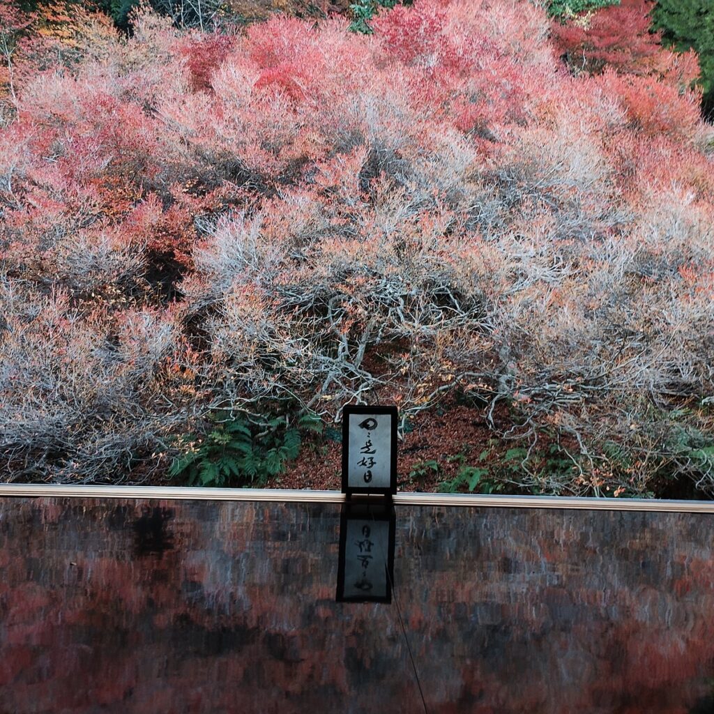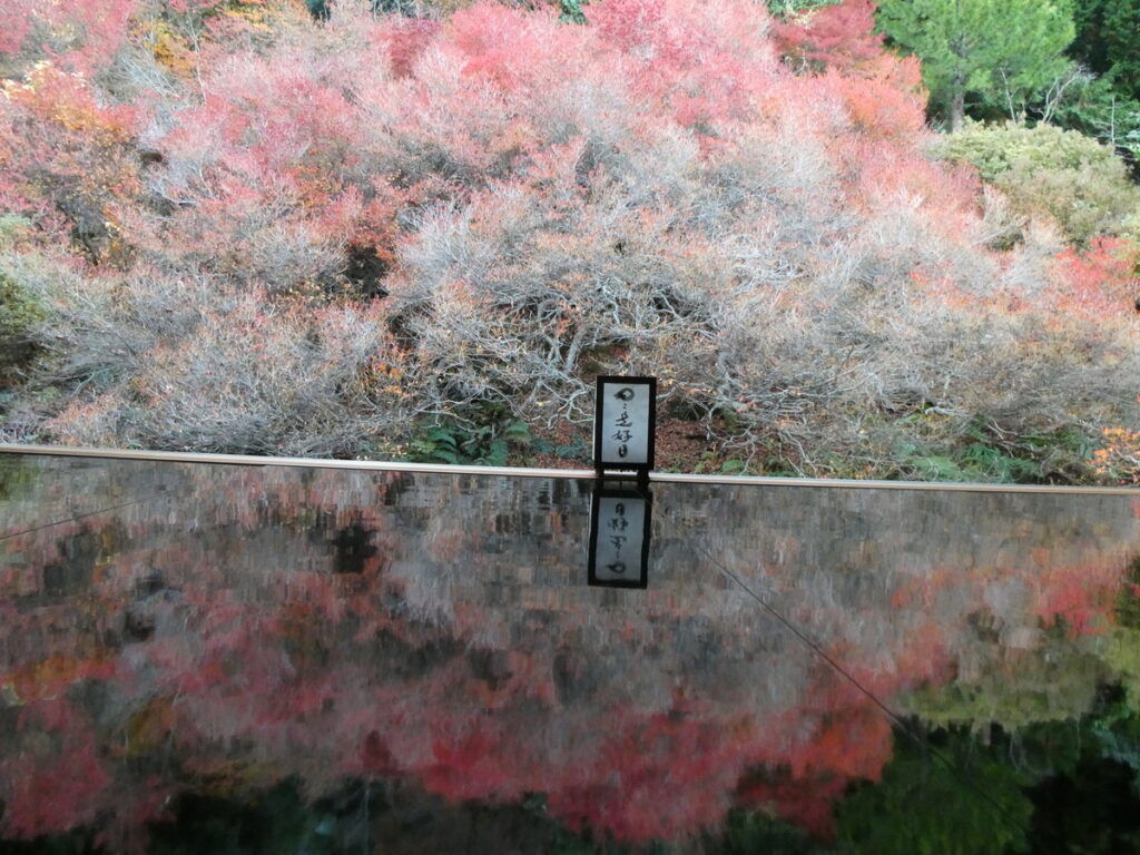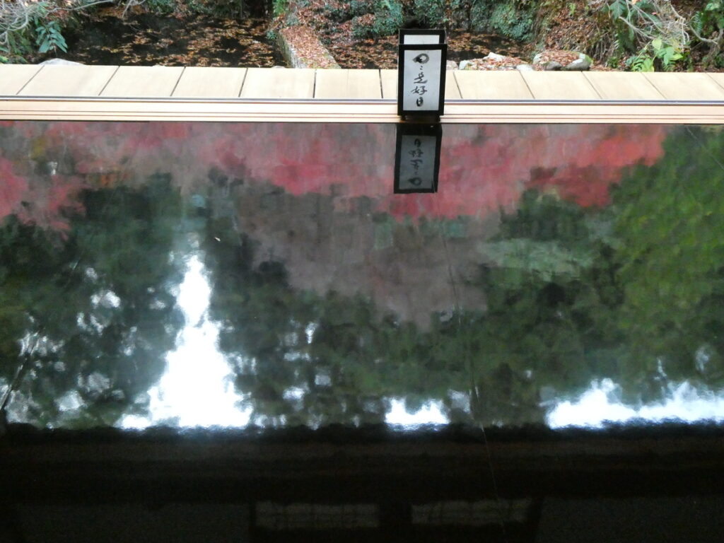 しかも境内はビックリするほど狭い!境内だけではない、本堂もビックリするほど小さい。そしてドウダンツツジの紅葉が見える所の戸が開け放たれ、床3分の1くらいに黒色のテカテカ光る板をおいている。この黒板があることで水面にうつった紅葉をみているかのような演出が完成している。