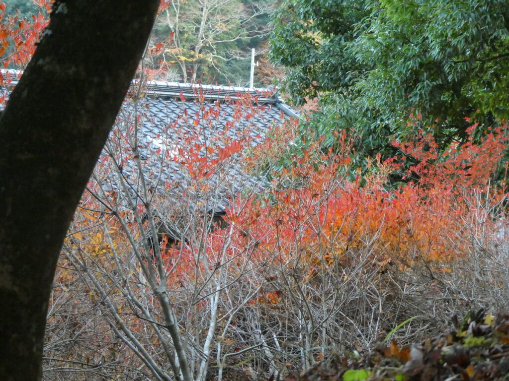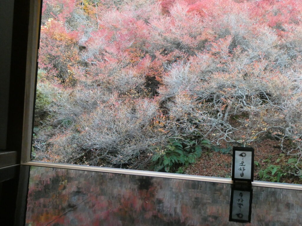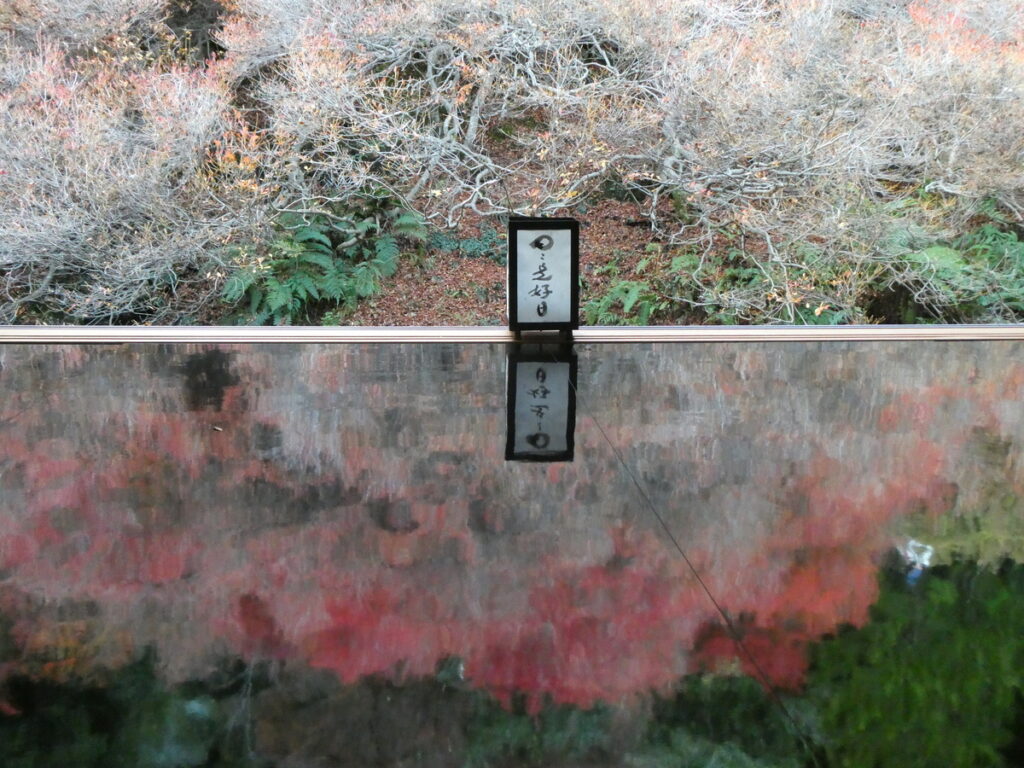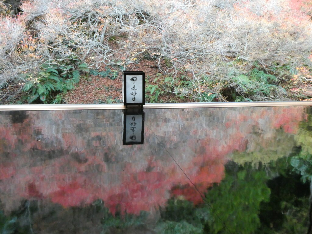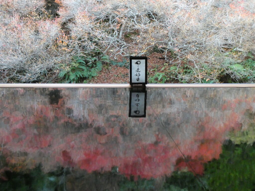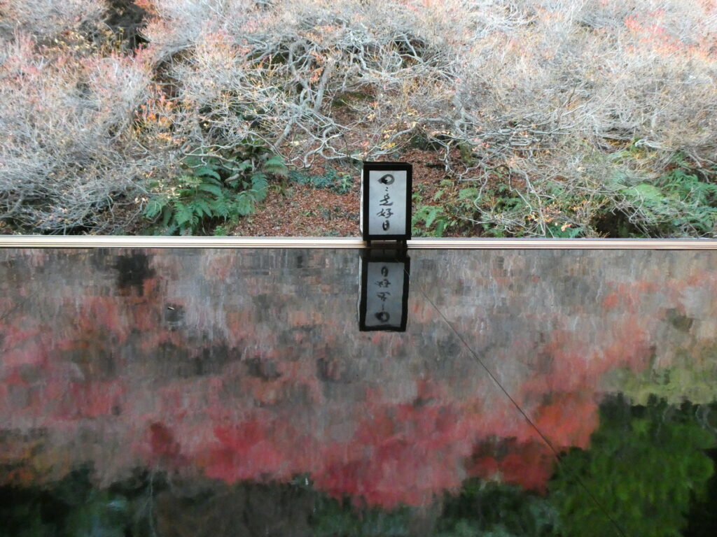 しかも境内はビックリするほど狭い!境内だけではない、本堂もビックリするほど小さい。そしてドウダンツツジの紅葉が見える所の戸が開け放たれ、床3分の1くらいに黒色のテカテカ光る板をおいている。この黒板があることで水面にうつった紅葉をみているかのような演出が完成している。