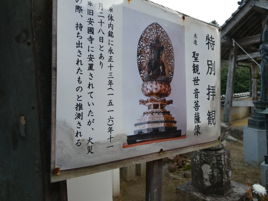 当時、但馬安国寺は、室町幕府から朱印と三百石余の禄が与えられていて、七堂伽藍を有する立派なお寺だったと伝わる。しかし、1717年の火災でそれらことごとくを焼失。現存している仏像は釈迦如来、聖観音菩薩、薬師如来の3像のみである。
