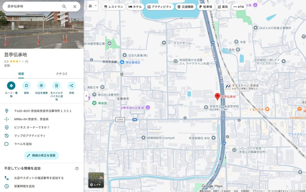 芸亭跡から徒歩10分程度、数百メートルの場所には奈良時代に建立された法華寺が今もある。総国分尼寺である法華寺は光明皇后の宮殿を寺院化したもので、当時の仏教の中心地のひとつ。法華寺の尼僧たちも嘗ては芸亭を利用したのだろう。