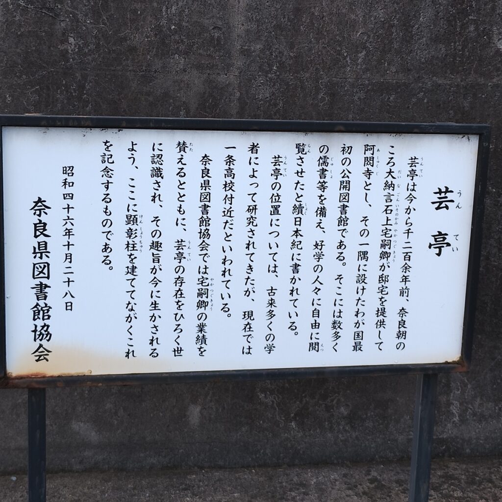 ここが、日本最初の公開図書館「芸亭」があったといわれているところだ。「芸亭」は“うんてい”と読むが、史料によっては“うんじょう”とも読まれる。