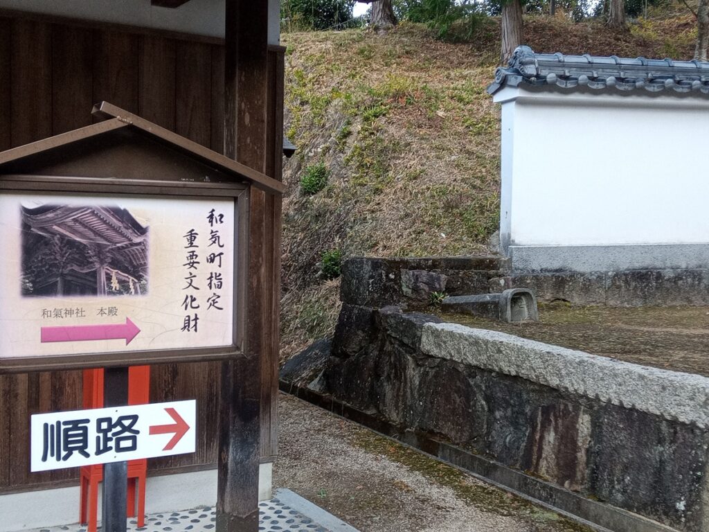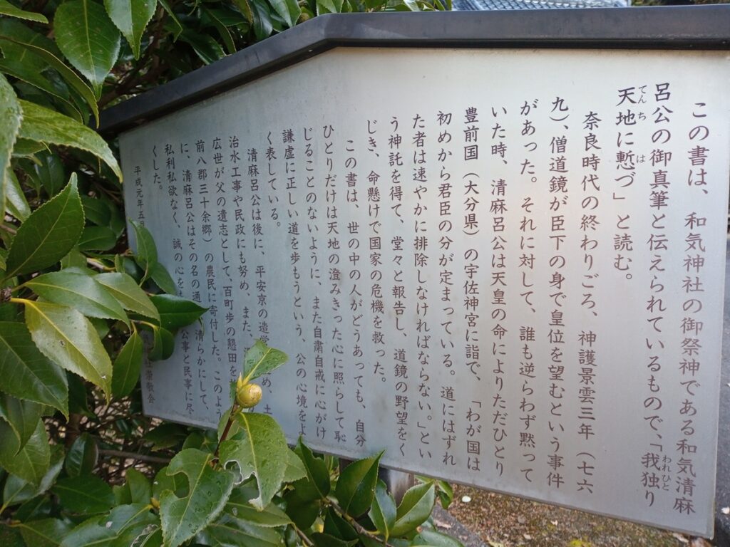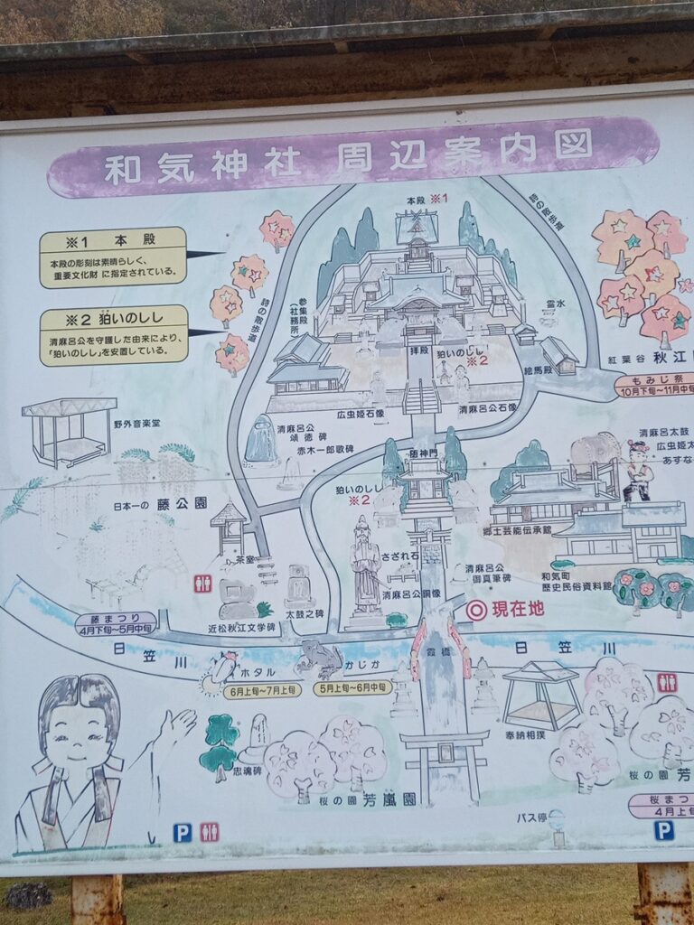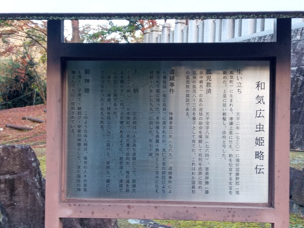 1914(大正3)年に和気神社と名称を変え、1919(大正8)年には、村社だったものを県社に格上げされた。「和気清麻呂公の忠烈無比を顕彰することは、国民教化の上でぜひとも必要である」との理由だそうだが、和気清麻呂と広虫のことは気に入っているが、政府のその理念は正直キモい。