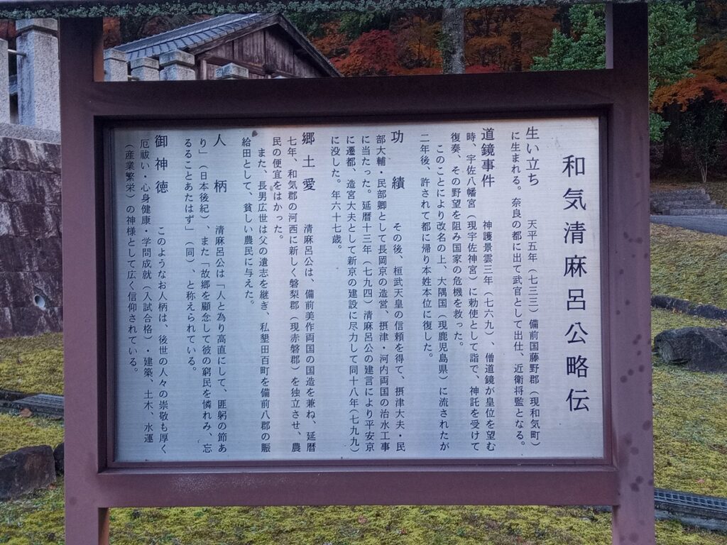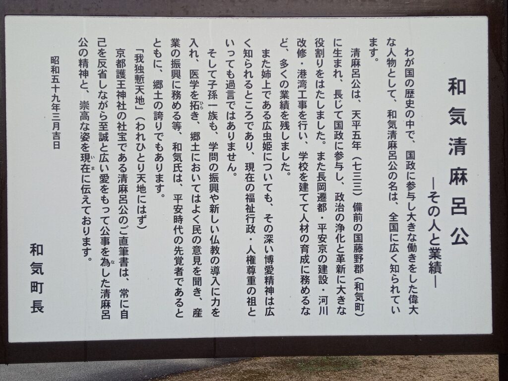 ちょうど日清・日露戦争が終わり韓国併合される少し前あたりでしょうかね。明治政府は皇国史観を浸透させるのに必死だったのでしょう。歴史上の人物を忠臣と賊臣にわけ、忠臣側である和気清丸は京都の護王神社にまつられるとともに、彼の生誕地であるこの地にも大々的にまつられたのですから。