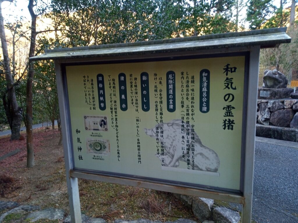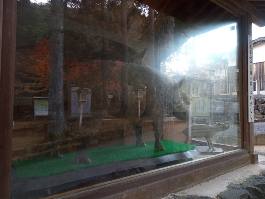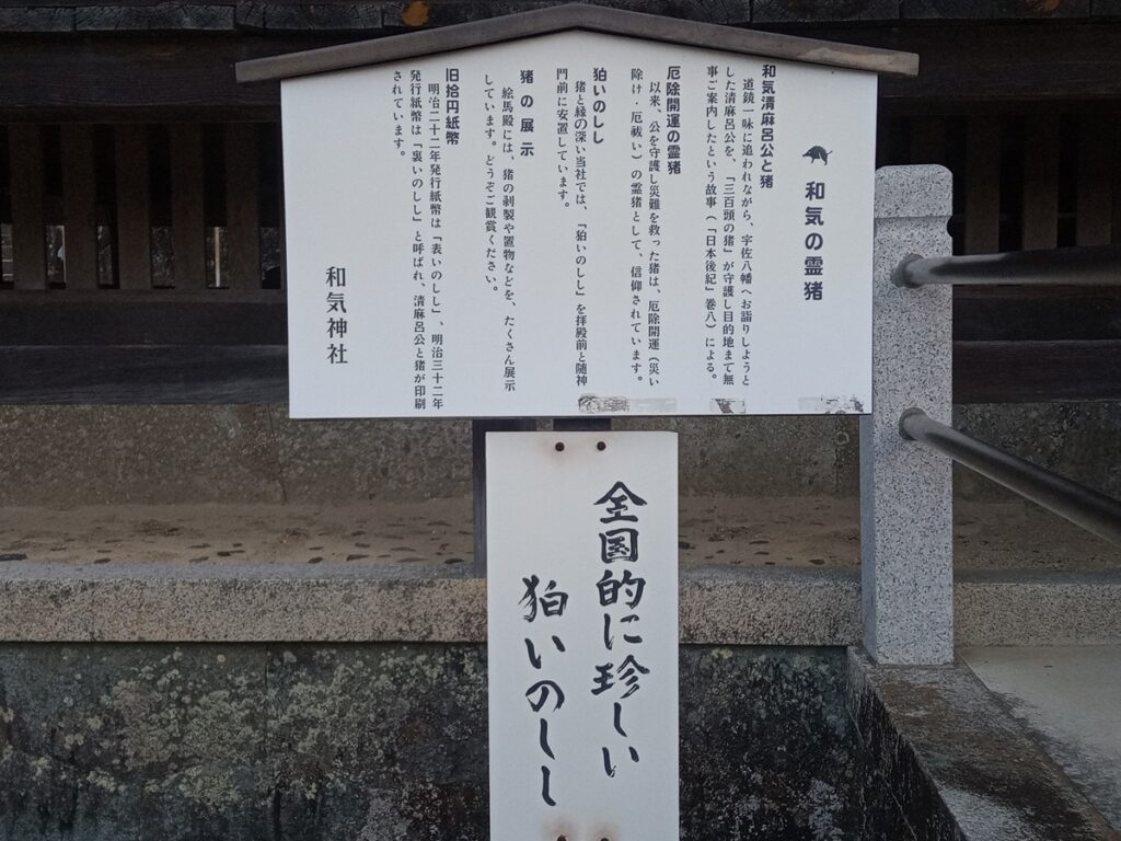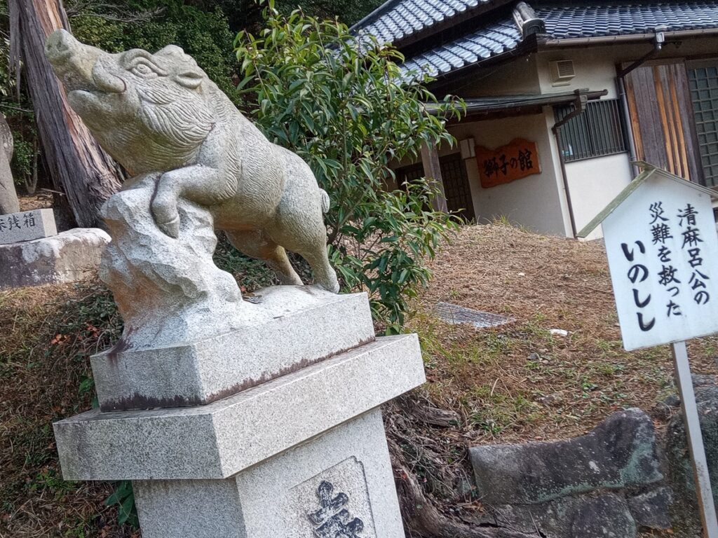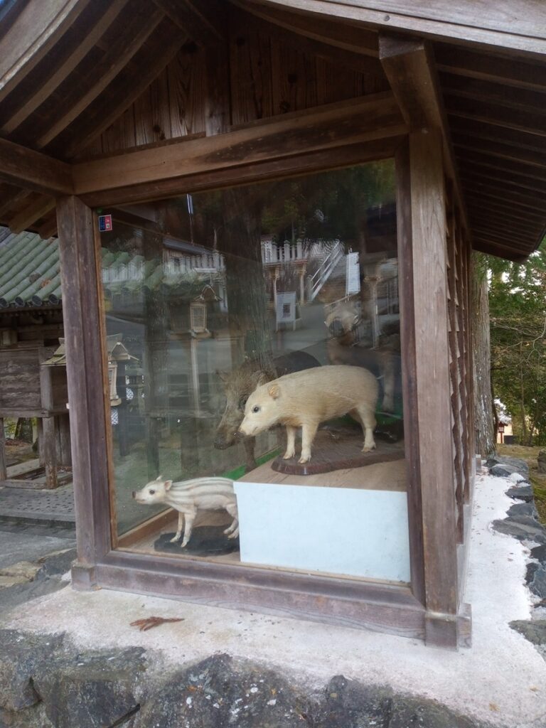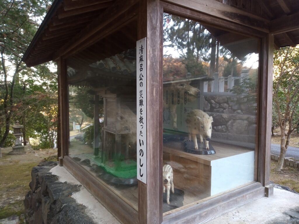 境内には、「清麻呂公の災難を救ったいのしし」と称する猪の剝製がガラスケースに入って展示されてある。