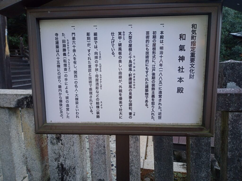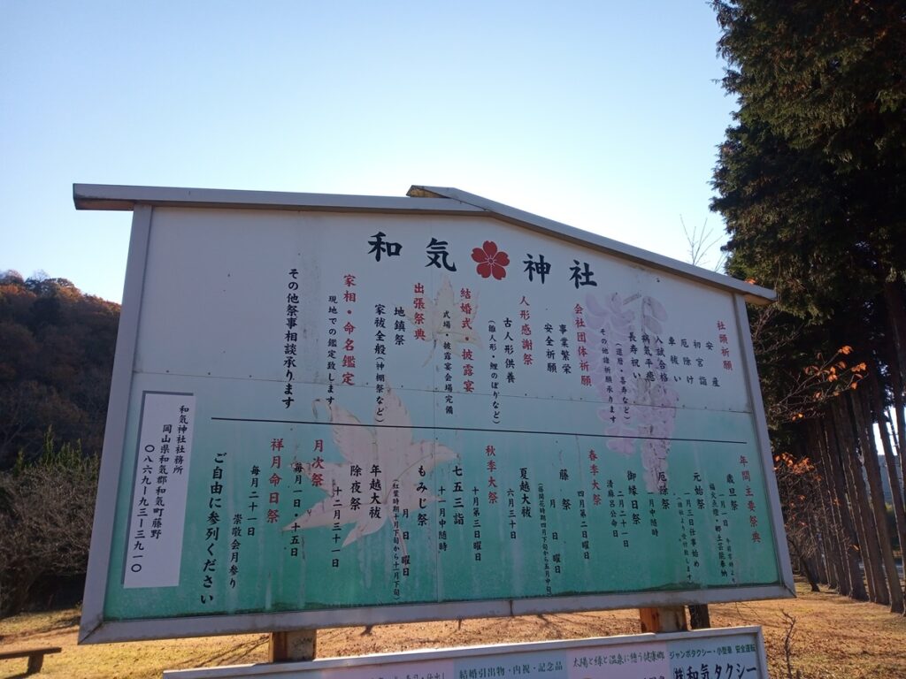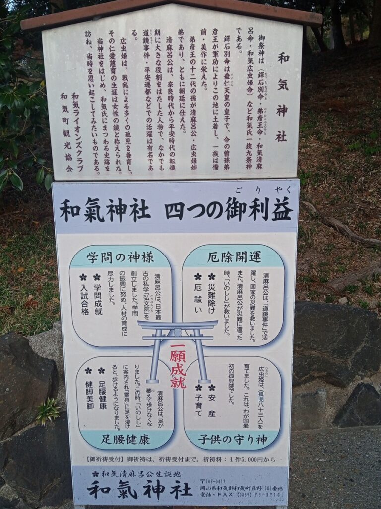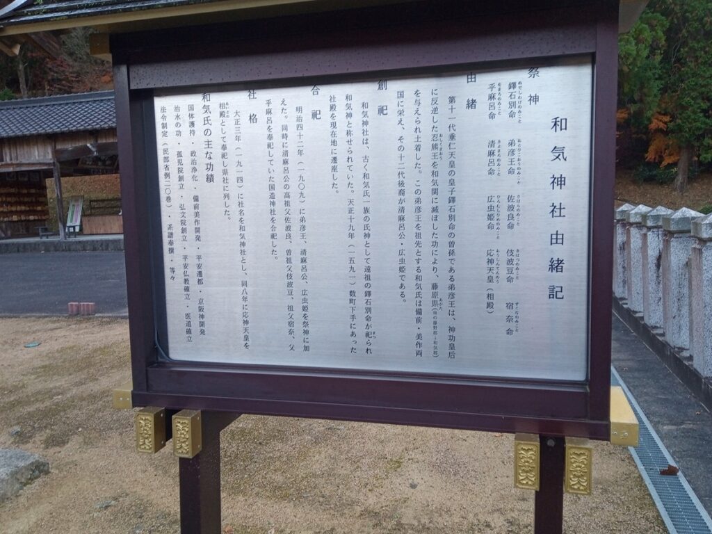 和気町藤野は、和気清麻呂、和気広虫の誕生地と推測されている地。和気神社はもともとは和気氏の氏神で、古代和気氏一族を祀っている御宮だった。和気氏の祖とされる 鐸石別命(ぬでしわけのみこと)が祀られ、「和気神」と称されていた。創建年代こそ定かではないものの奈良時代にまで遡ると言われている。