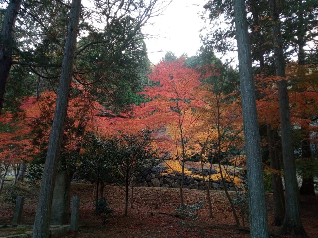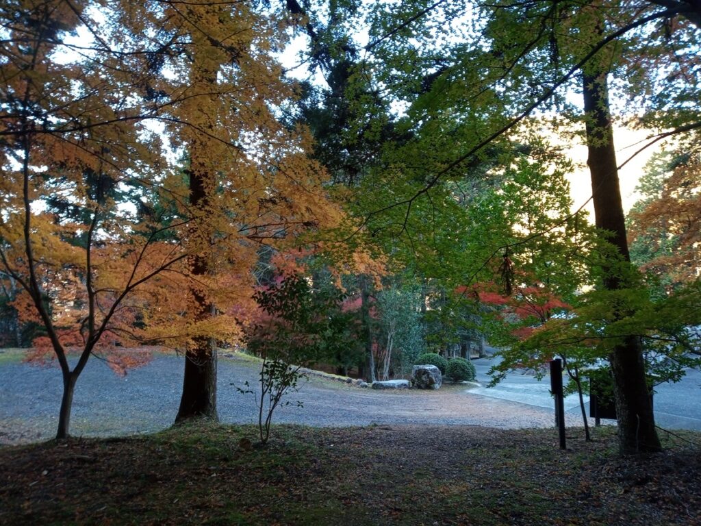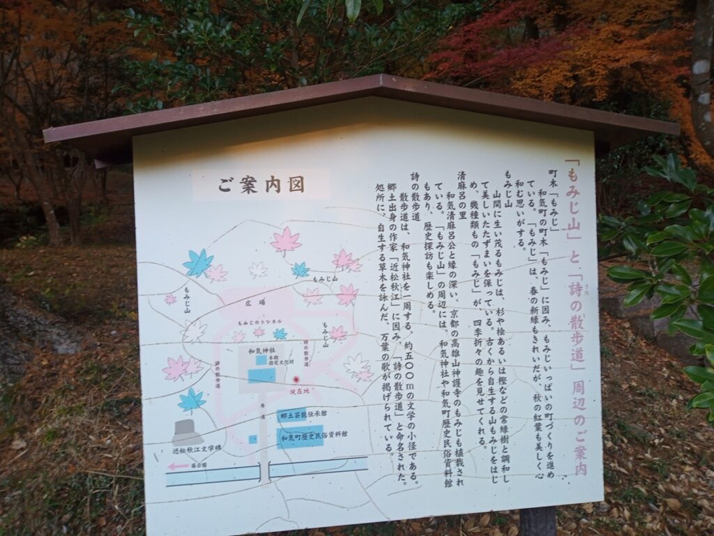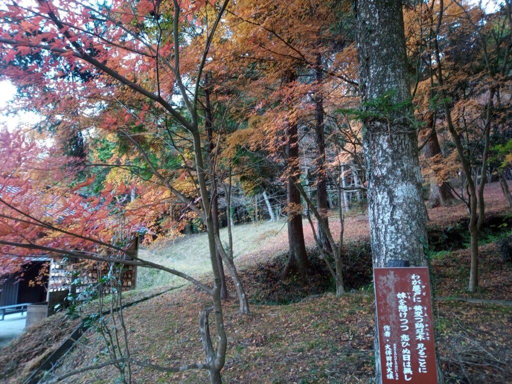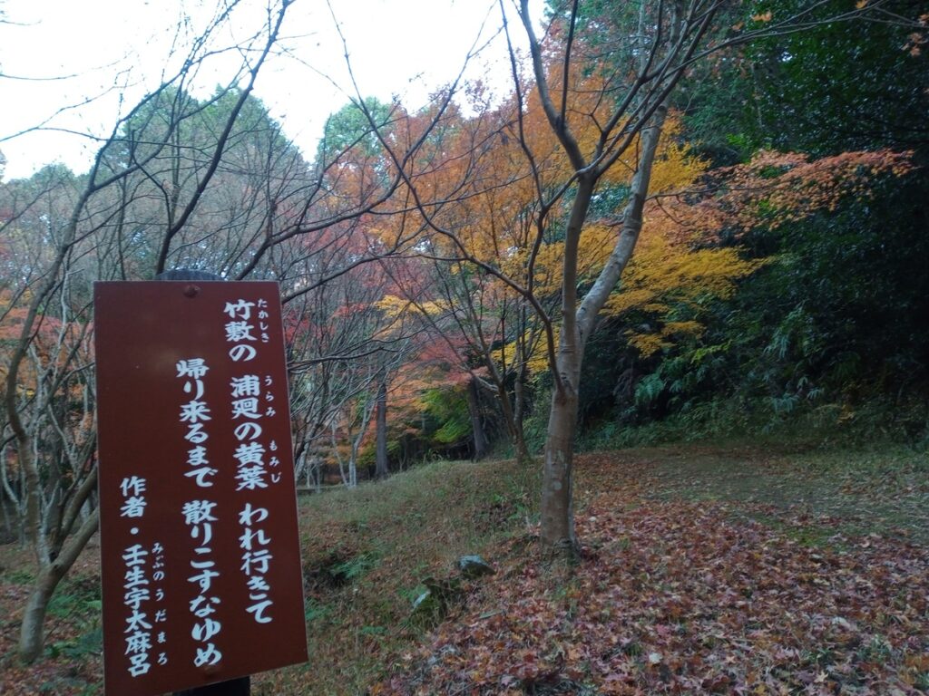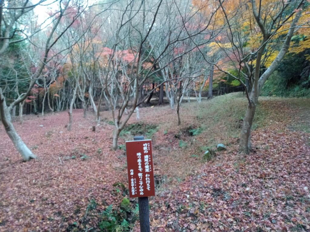 境内のもみじ山には、ところどころに短歌が刻まれた看板がたっていて情緒あふれる、タイムスリップしたかのような錯覚を覚える。紅葉が緑から黄色や赤に紅葉し始めているものあり、色とりどりで夢の中にいるみたい。
