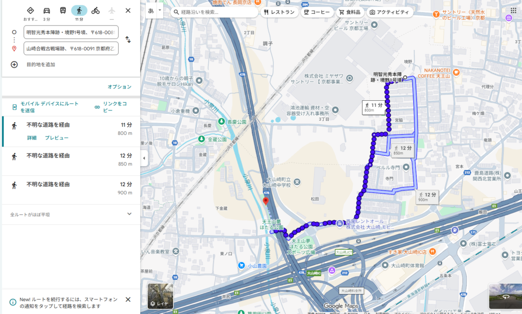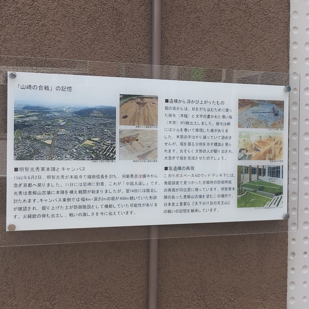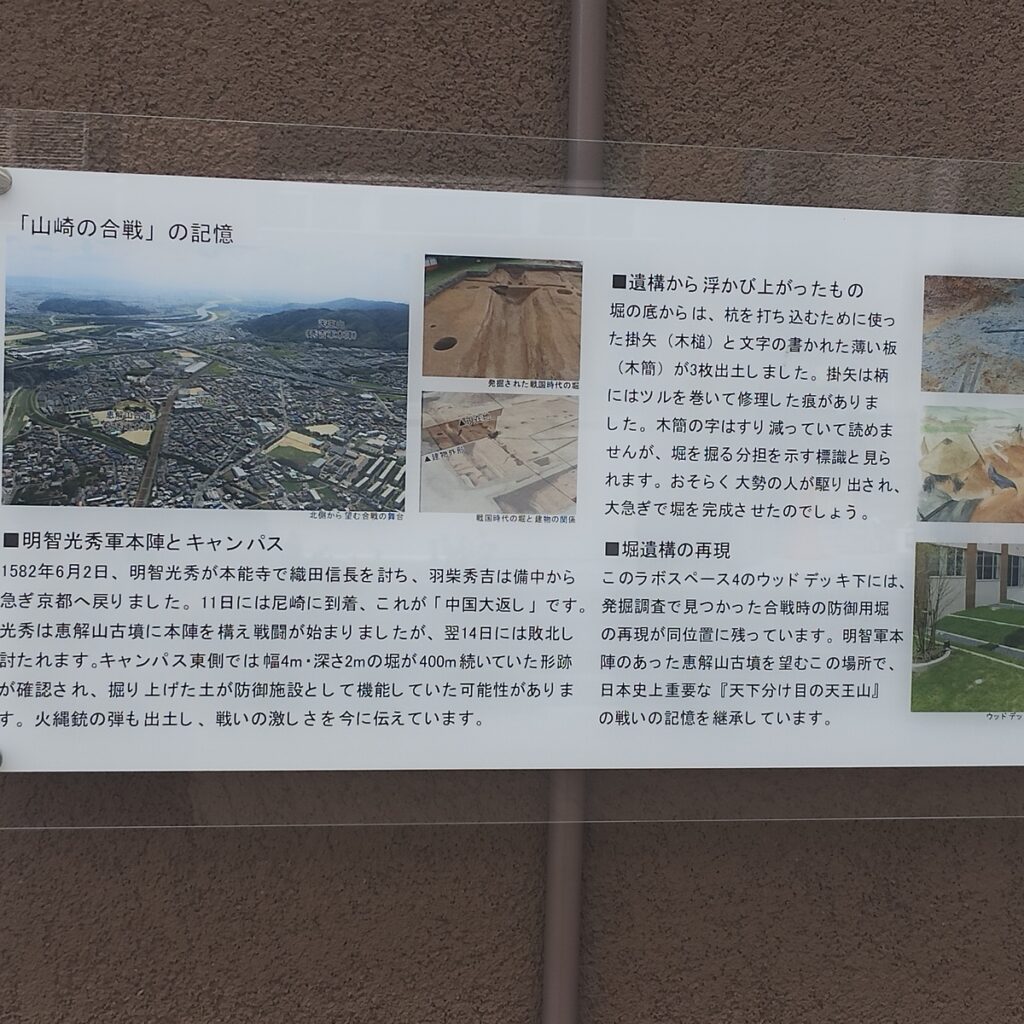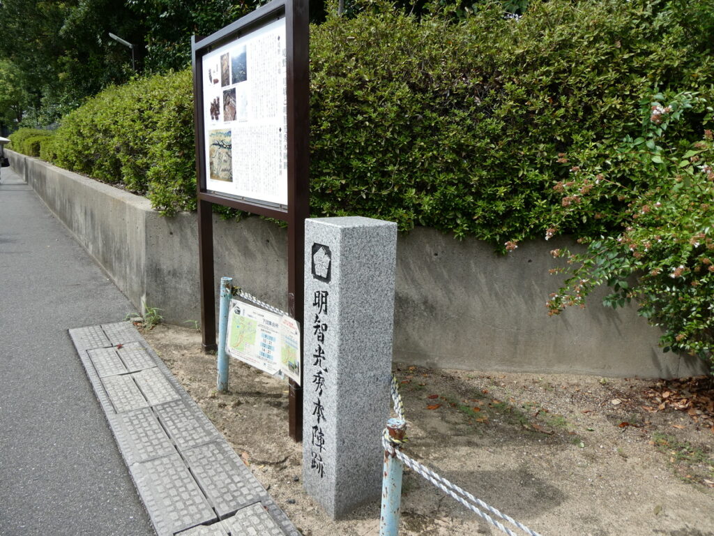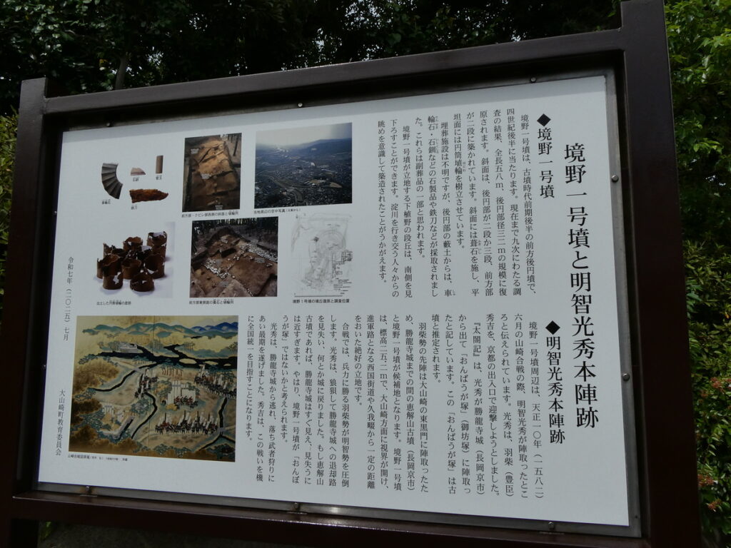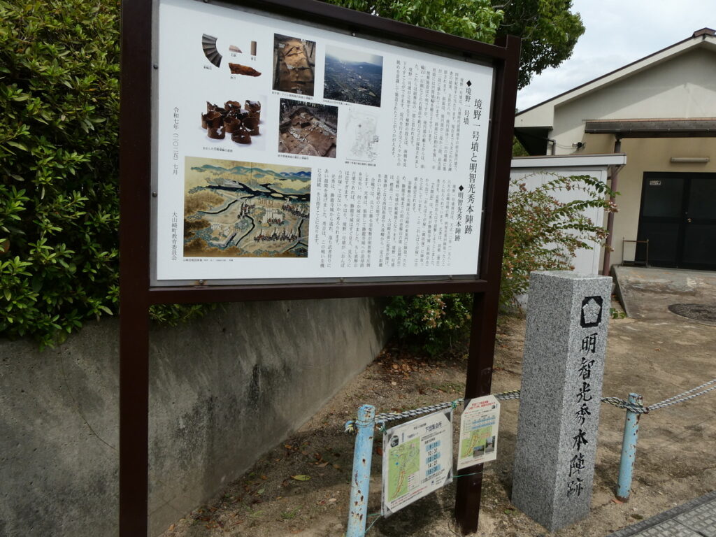 ここから徒歩10分ほどの距離には光秀が本陣を敷いた境野一号墳がある。本陣跡近くの非公開区域では、合戦当時に急造されたとみられる堀の痕跡が確認されている。現在は一般公開されていないが、戦いの切迫感を静かに物語っている。